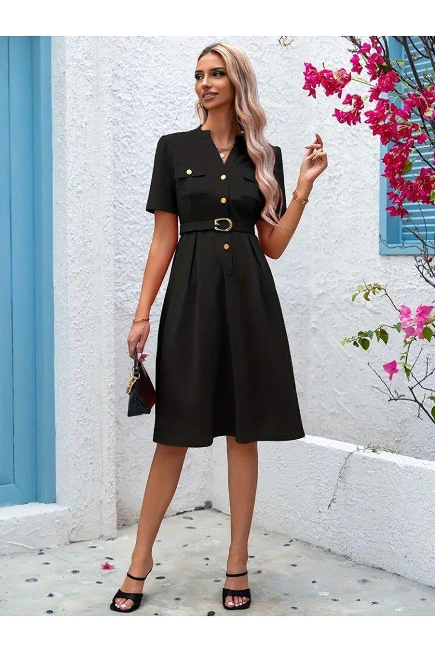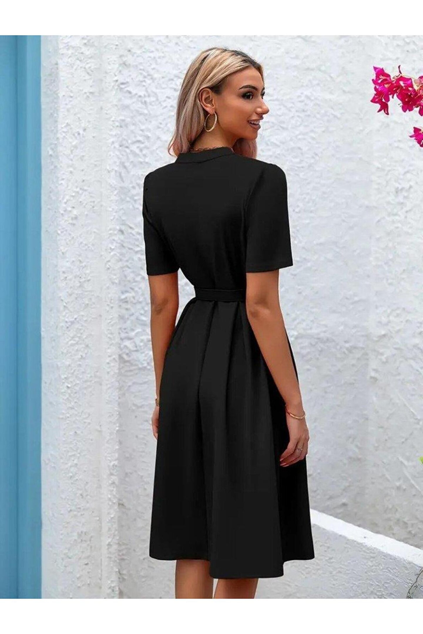 Kadın Kısa Kollu Düğmeli Ve Kemerli Atlas Elbise