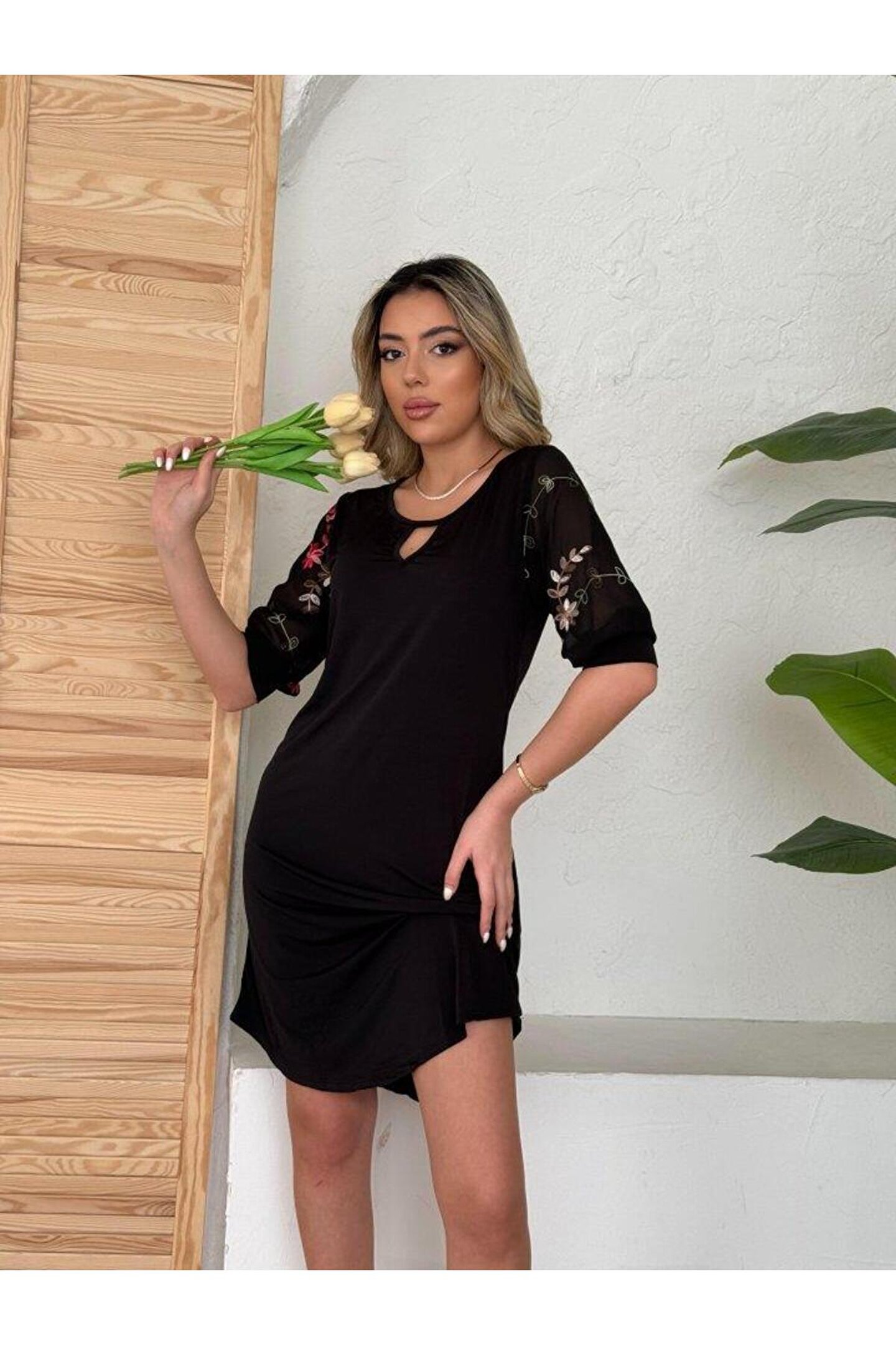Kadın Fakir Kol çiçek Desenli Tül Kol Bisiklet Yaka çiçek Desen Sandy Salaş Kısa Elbise hediye paketi yapılabilir