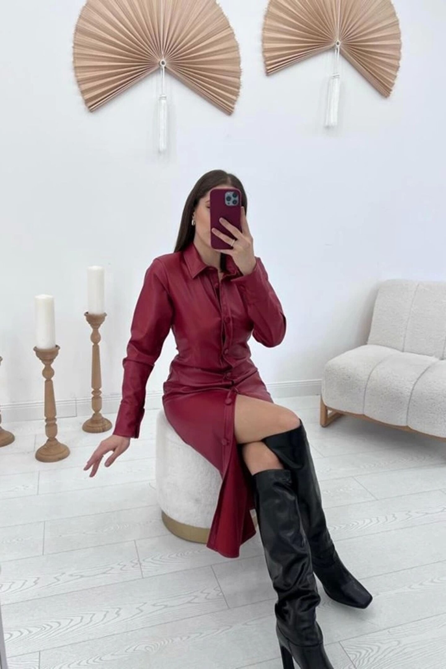 Wear Up Kırmızı Boydan Düğmeli Deri Elbise