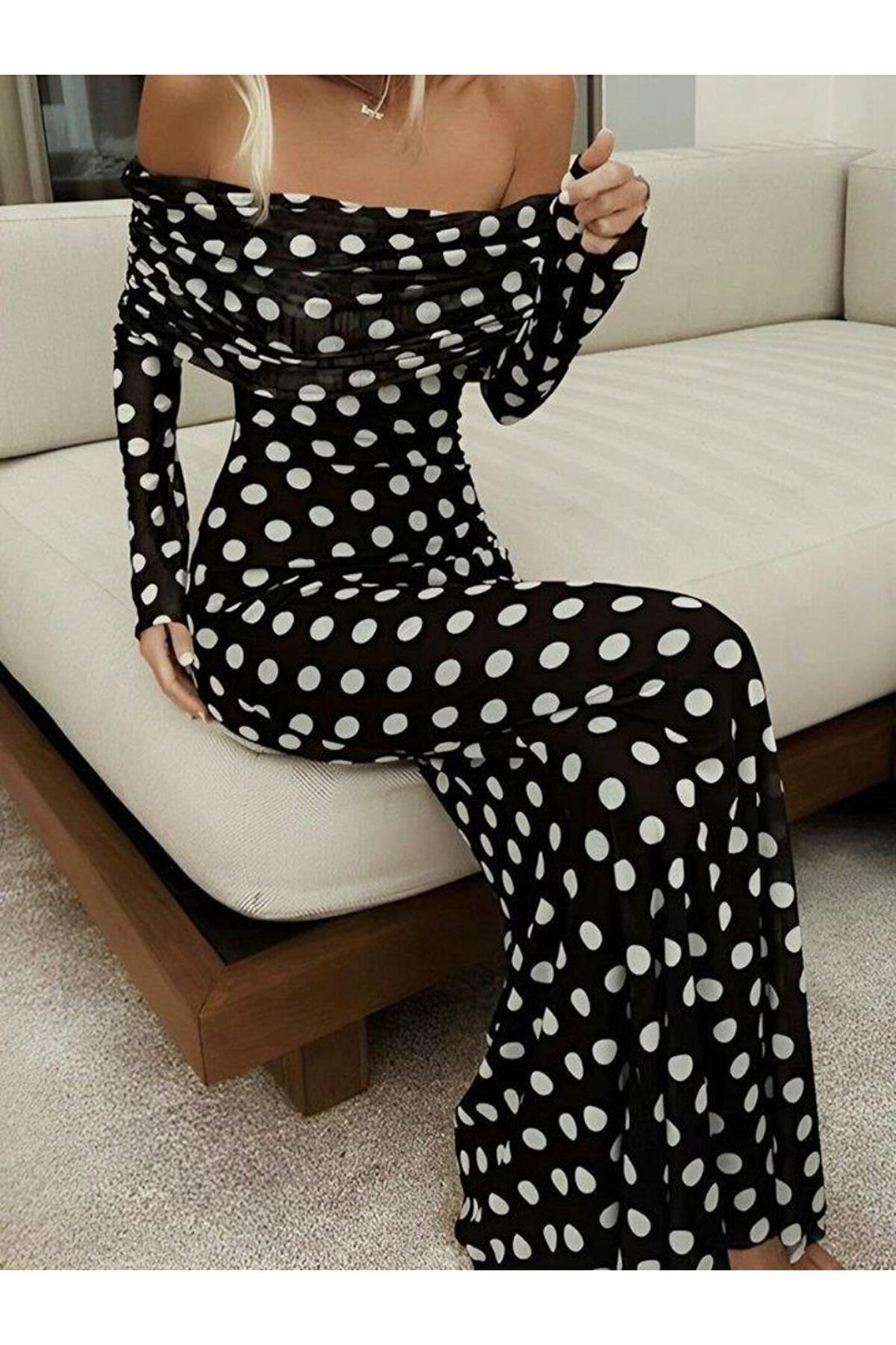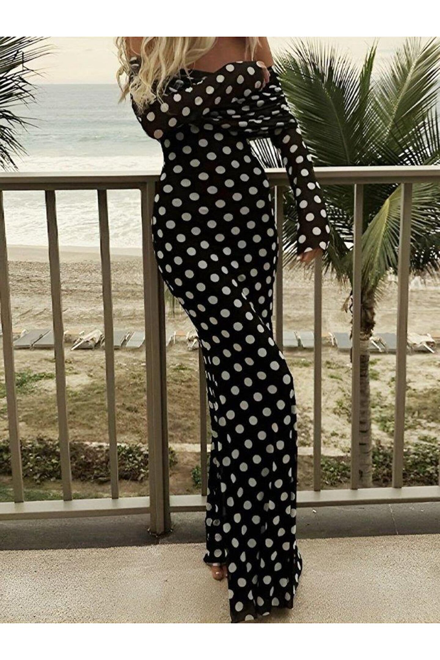 Puantiyeli Tül İçi Astarlı Madonna Yaka Maxi Boy Elbise