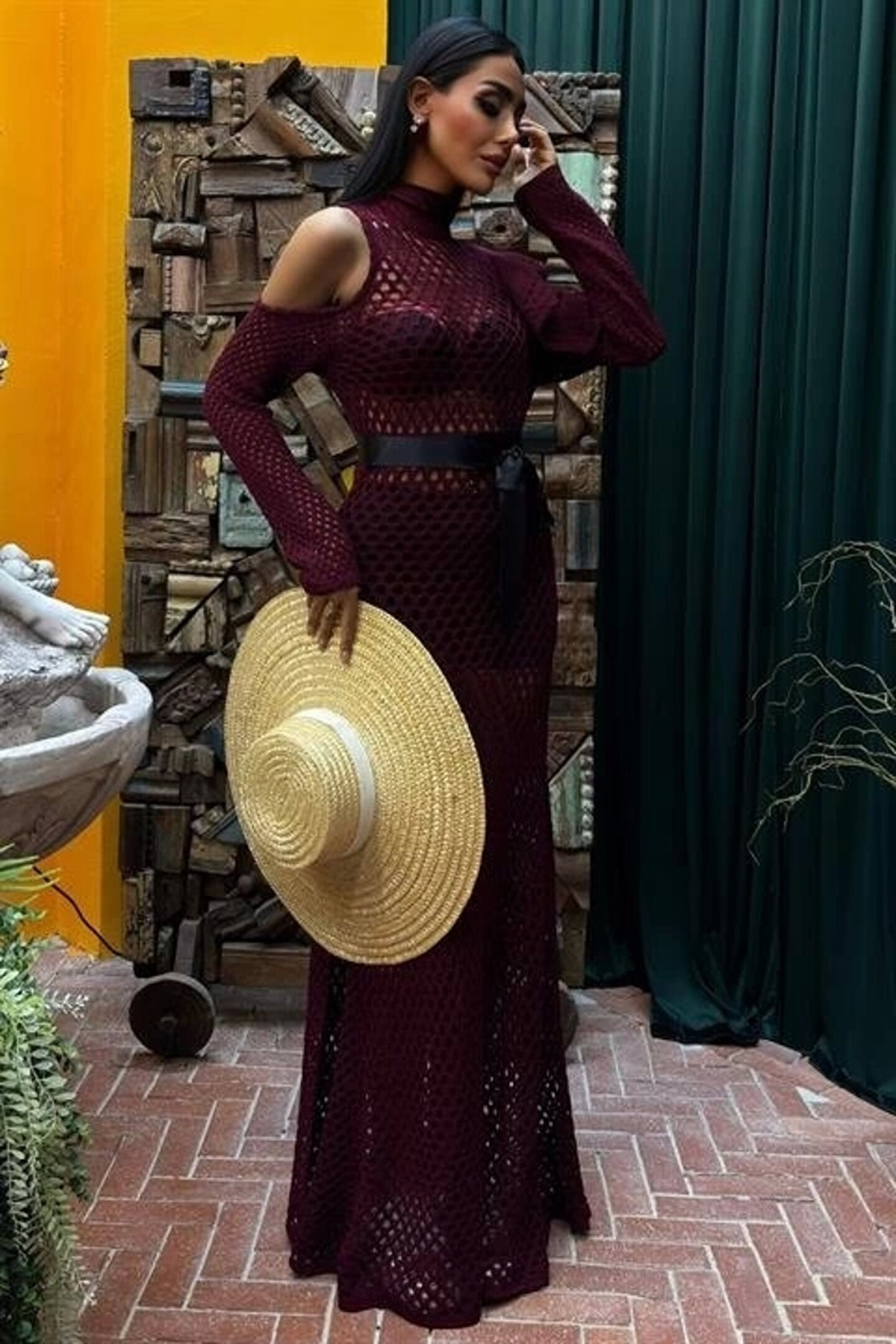 Saten Kuşaklı Ajurlu Triko Elbise 2847