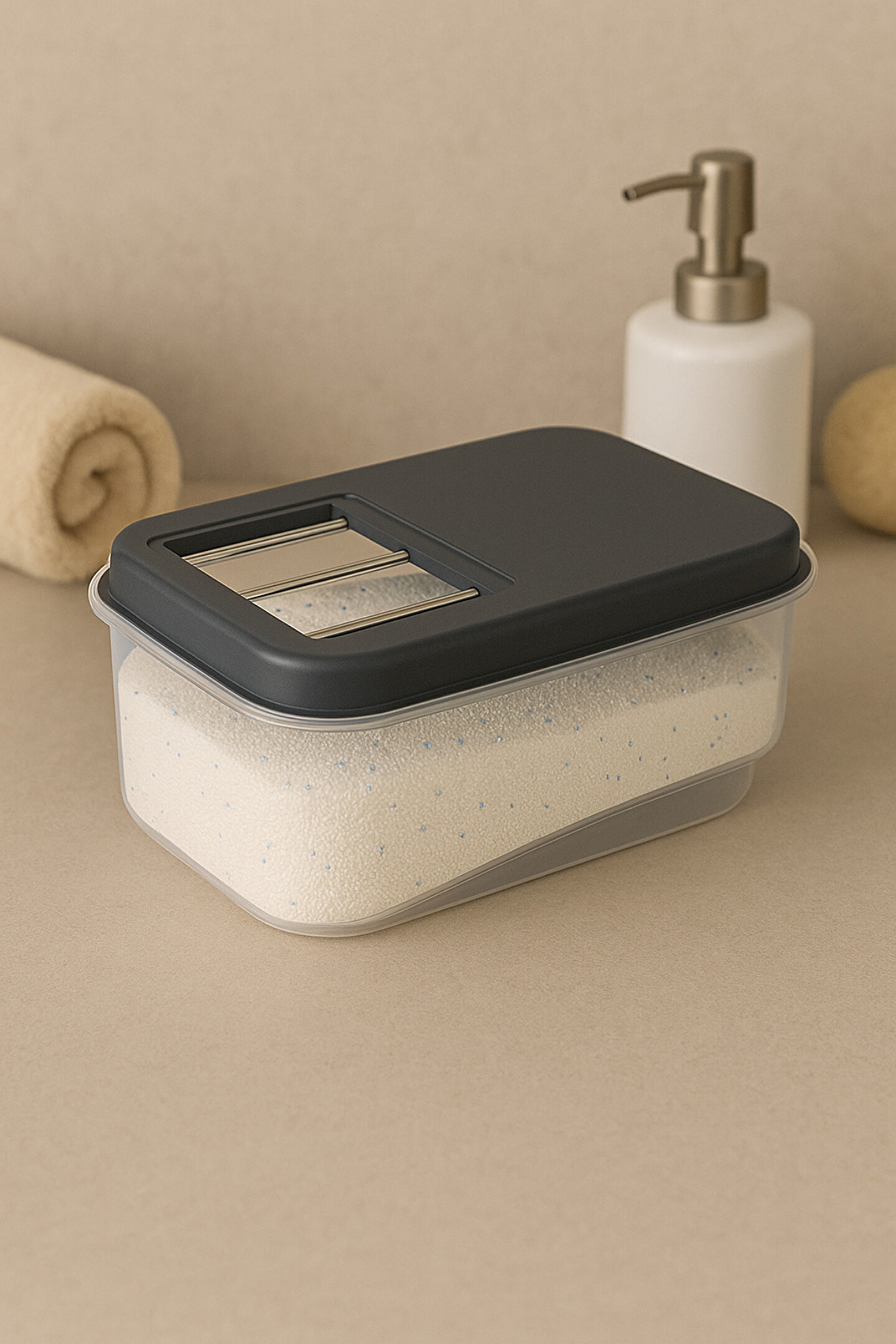 Banyonuzda düzeni ve şıklığı bir araya getiren bu 5 litrelik şeffaf deterjan saklama kabı, toz deterjanlarınızı hijyenik ve pratik şekilde muhafaza etmenizi sağlar.
