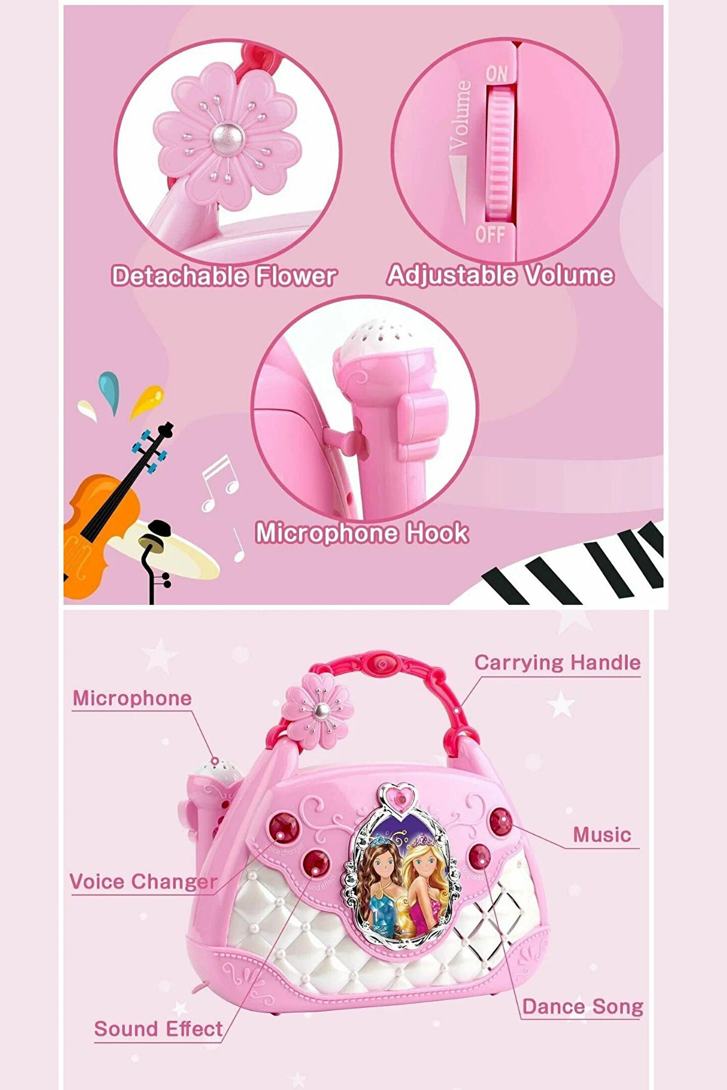 Mikrofon ve MP3 Çalar: ; Oyuncak set, bir mikrofon ve entegre bir MP3 çalar içerir. Bu sayede çocuklar, sevdikleri şarkıları söyleyebilir ve kendi performanslarını gerçekleştirebilirler. ; Karaoke ve Parti Teması: ; Set, karaoke özellikleriyle çocuklara kendi şarkılarını söyleme ve arkadaşlarıyla eğlenceli parti müzikleri yapma fırsatı sunar. ; El Çantası Tasarımı: ; Oyuncak, taşıması kolay bir el çantası tasarımına sahiptir. Bu, çocukların oyuncaklarını istedikleri yere kolayca taşımalarına ve paylaşmalarına olanak tanır. ; Renkli ve Çekici Tasarım: ; El çantası ve içindeki oyuncaklar renkli ve çekici bir tasarıma sahiptir. Bu, çocukların dikkatini çeker ve oyuncaklarıyla etkileşimde bulunmalarını teşvik eder. ; Eğlenceli Ses Efektleri: ; Oyuncak mikrofon ve MP3 çalar, eğlenceli ses efektleri içerebilir. Bu, çocukların performanslarını daha keyifli hale getirir. ; Güvenli ve Dayanıklı Malzemeler: ; Tüm oyuncaklar, çocuk güvenliği gözetilerek tasarlanmış dayanıklı malzemelerden üretilmiştir. ; Pil İle Çalışma: ; Set, genellikle pil ile çalışır, böylece çocuklar istedikleri zaman ve her yerde müzikle etkileşimde bulunabilirler. ; Eğitici ve Geliştirici: ; Karaoke ve müzikal etkileşim, çocukların müzikle ilgili temel becerilerini geliştirmelerine ve özgüven kazanmalarına yardımcı olabilir. ;