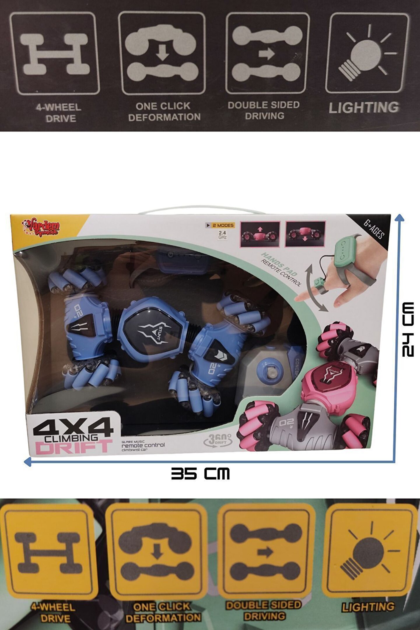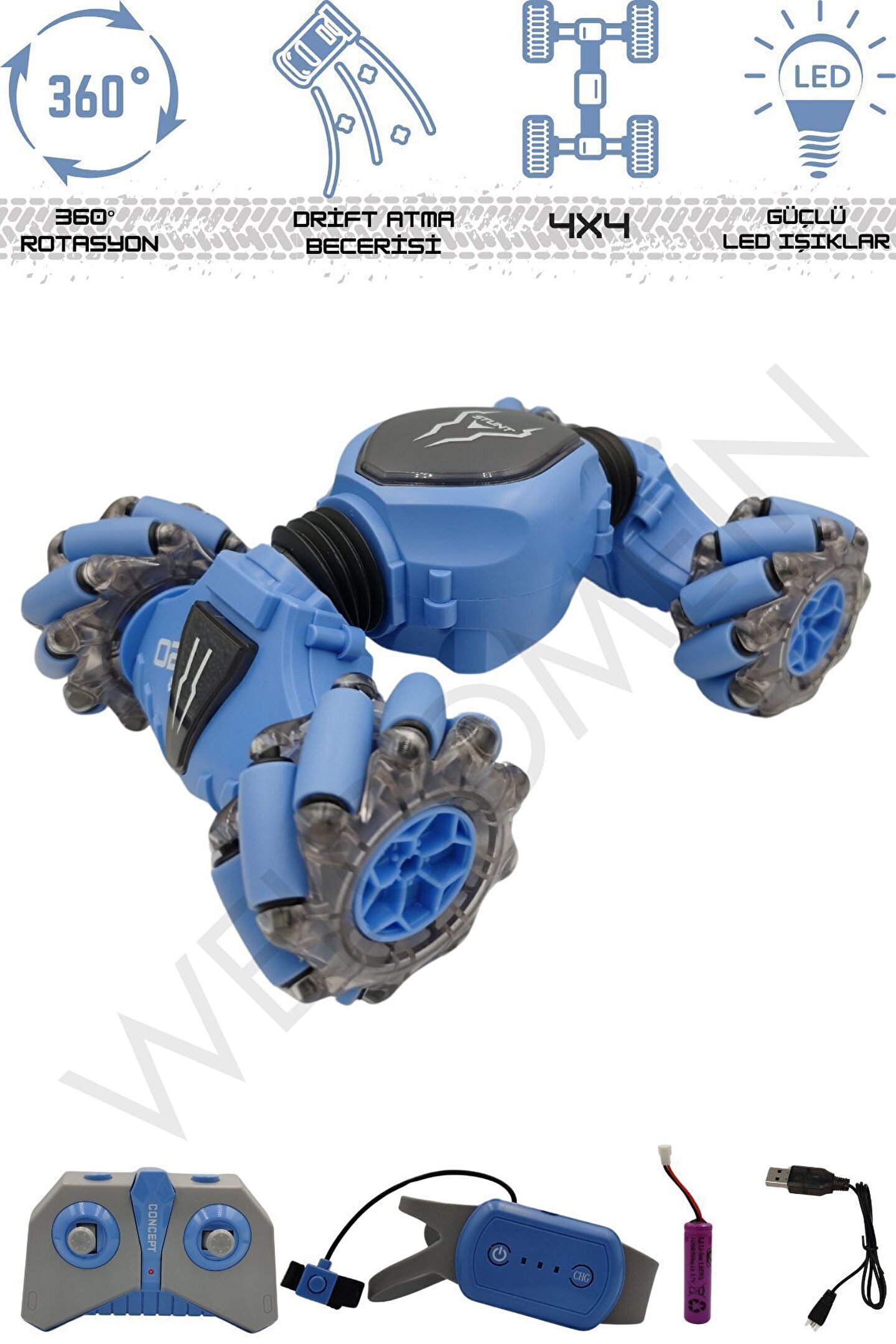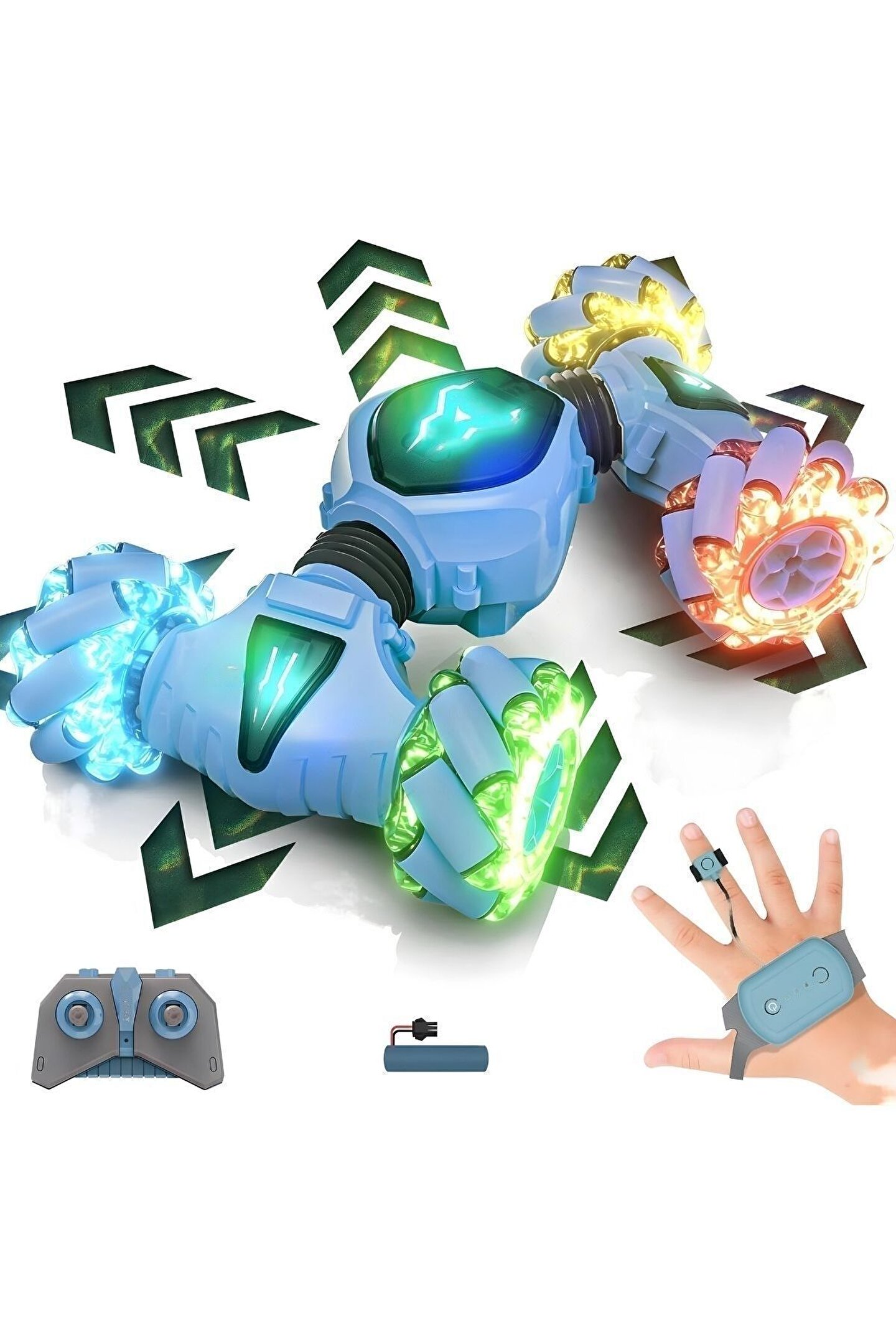 - 2.4 GHz frekansında bir bilekten kumandalı ve bir uzaktan kumandalı olmak üzere 2 adet kumandaya sahiptir. ; - Yatay gidebilen lastikleri sayesinde zorlu manevraları kolayca gerçekleştirebilir ve drift atabilir. ; - Dikey hale gelebilen özelliği sayesinde eğlenceli ve heyecan verici sürüş deneyimi sunar. ; - Tırmanma özelliği ile engelleri aşar. ; - Güçlü led ışık efektleriyle donatılmıştır, hem gündüz hem de gece kullanımı için uygundur. ; - Çocukların el-göz koordinasyonunun gelişmesine yardımcı olur. ; - Çocuklar ve yetişkinler için eğlenceli ve dinamik bir sürüş deneyimi sunar. ; - Kumandalar 2 adet ince(kumanda pili)pil ile çalışır. ; (piller dahil değildir);