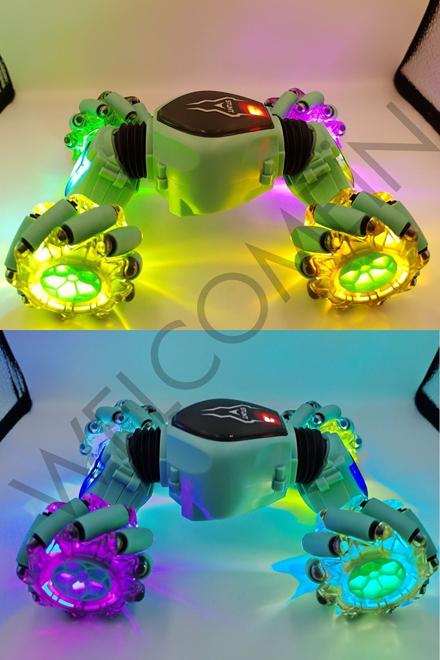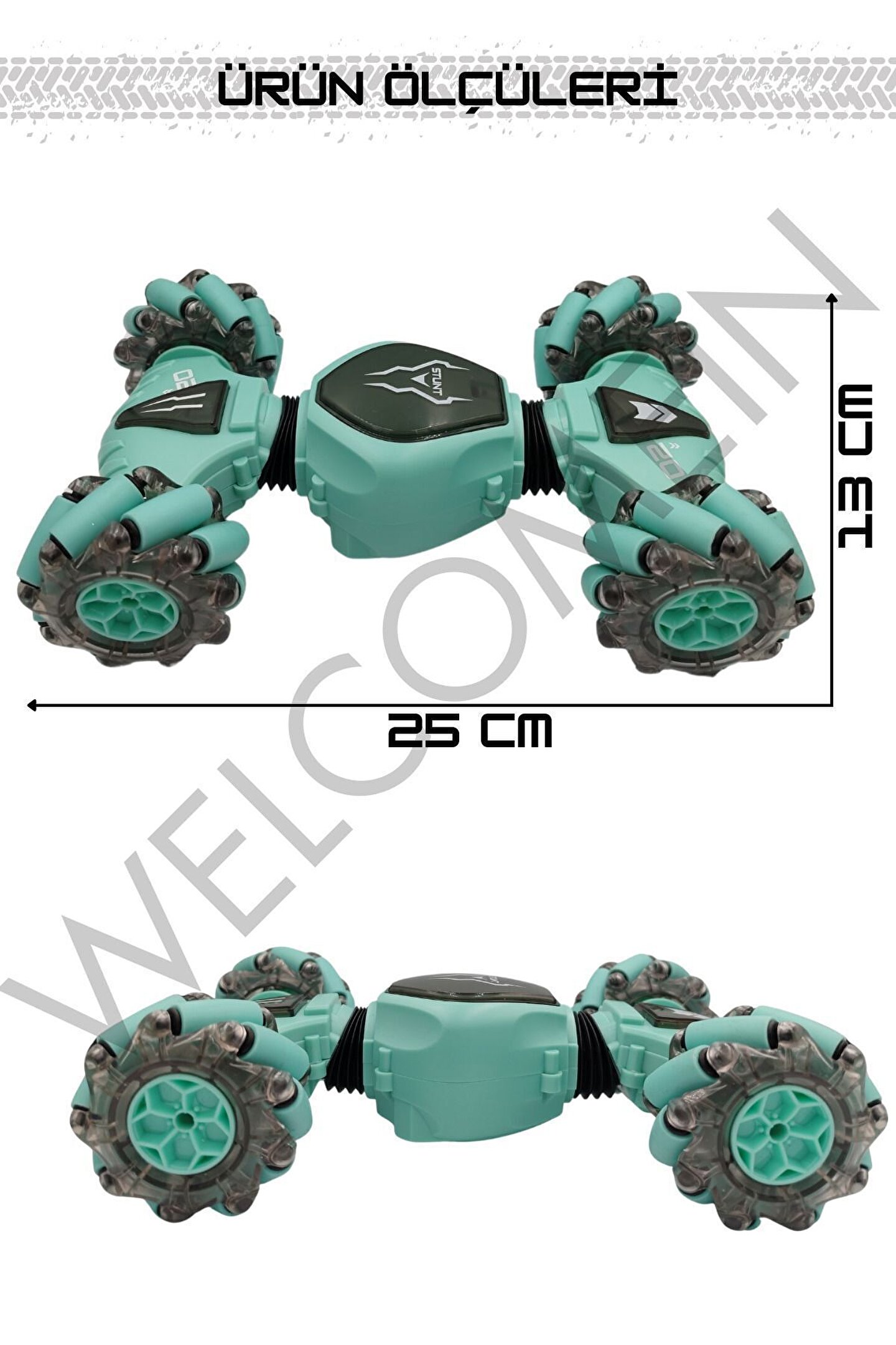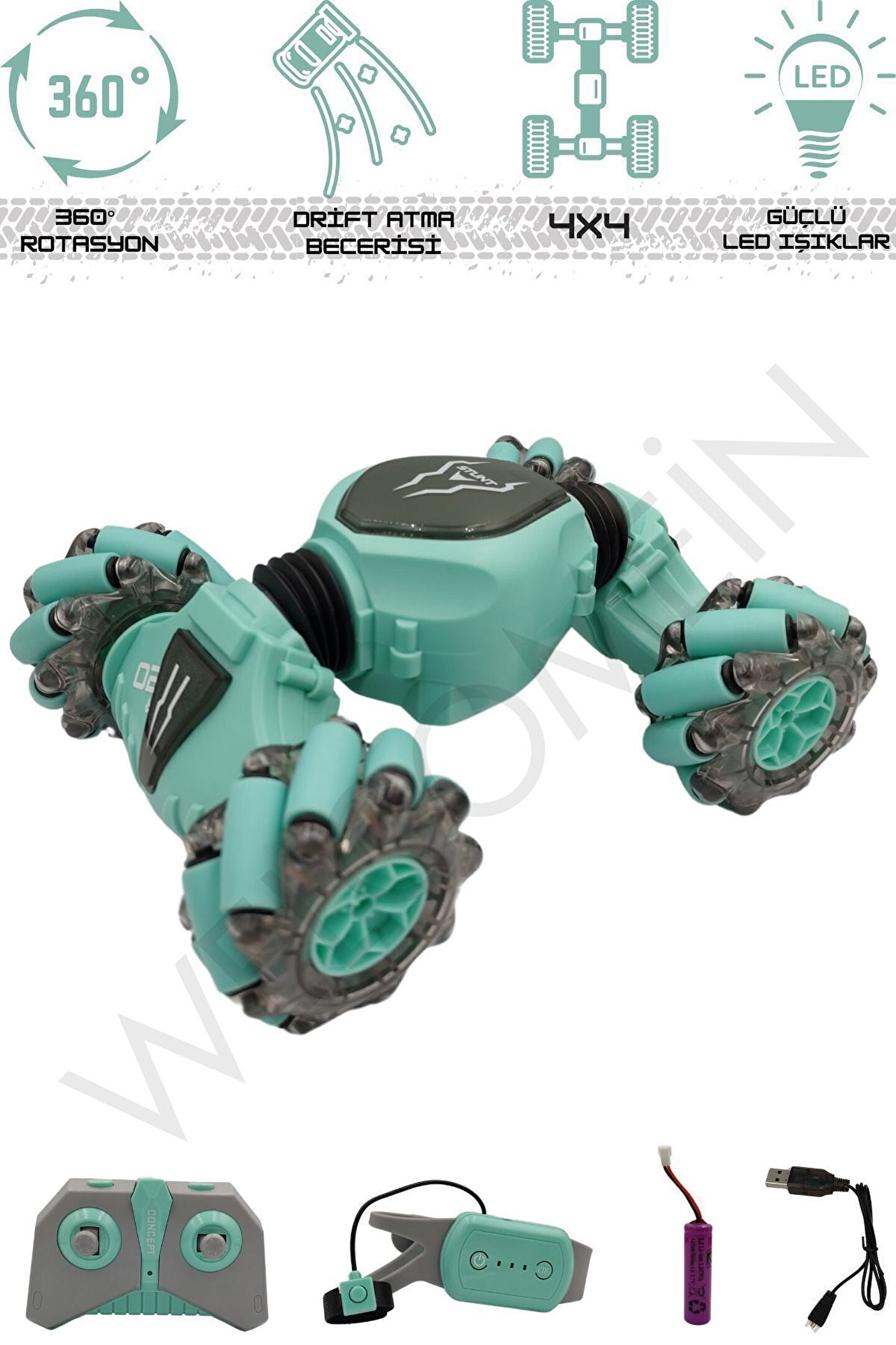 2; 4 GHz frekansında bir bilekten kumandalı ve bir uzaktan kumandalı olmak üzere 2 adet kumandaya sahiptir; Yatay gidebilen lastikleri sayesinde zorlu manevraları kolayca gerçekleştirebilir ve drift atabilir; Dikey hale gelebilen özelliği sayesinde eğlenceli ve heyecan verici sürüş deneyimi sunar; Tırmanma özelliği ile engelleri aşar; Güçlü led ışık efektleriyle donatılmıştır, hem gündüz hem de gece kullanımı için uygundur; Çocukların el; göz koordinasyonunun gelişmesine yardımcı olur; Çocuklar ve yetişkinler için eğlenceli ve dinamik bir sürüş deneyimi sunar; Kumandalar 2 adet ince(kumanda pili)pil ile çalışır; (piller dahil değildir);