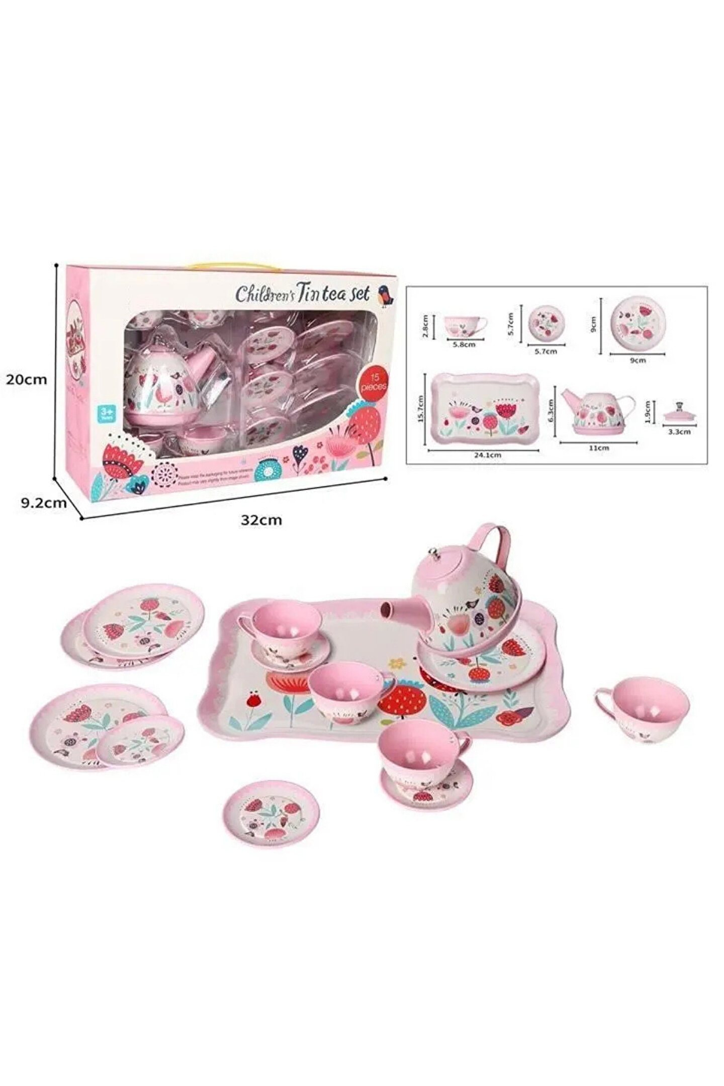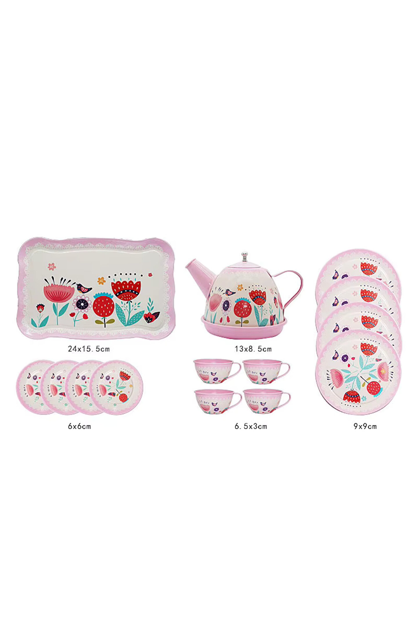 • Mükemmel Hediye Seçeneği: Özellikle doğum günü, yılbaşı ya da özel günler için ideal bir hediye seçeneğidir. Çiçekli Renkli Metal Çay Seti, çocukların evcilik oyunlarına renk katacak ve onlara eğlenceli saatler yaşatacaktır.