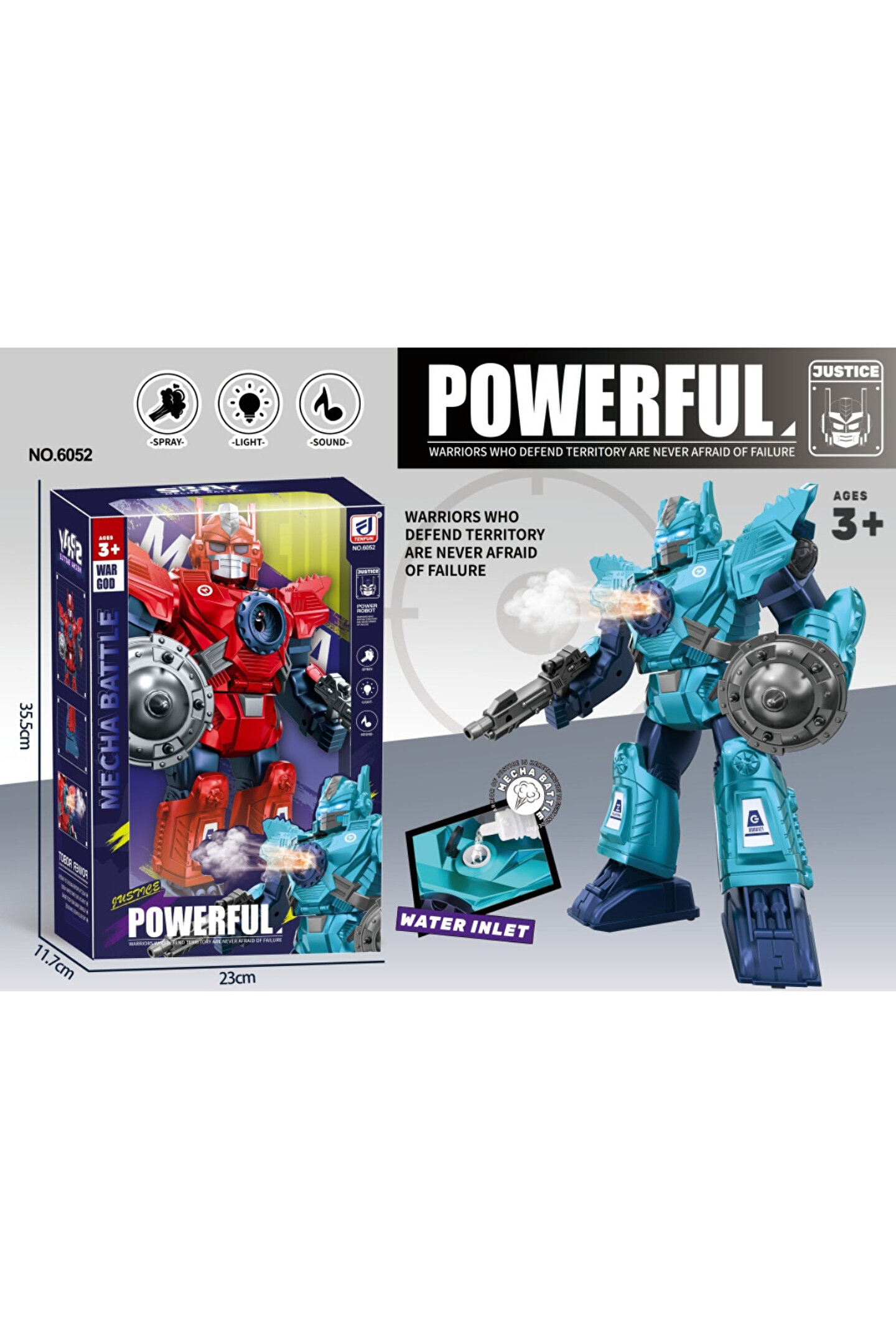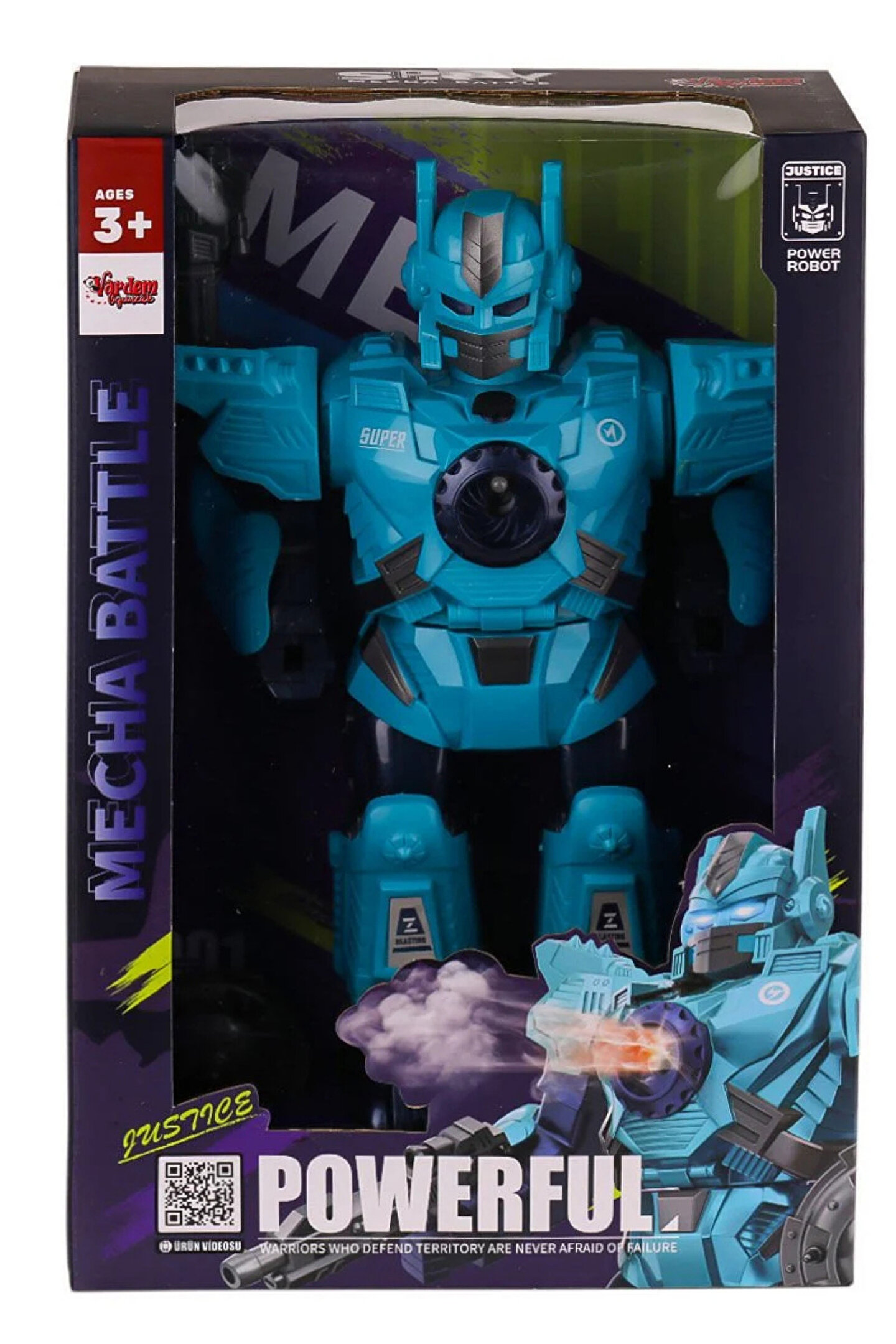 - Enerji ihtiyacını karşılamak için pillerle çalışan bu oyuncak, hareketli tasarımıyla çocukların ilgisini çeker.; - Işıkları ve müzikleriyle dikkat çeken bu savaşçı robot, eğlenceli vakit geçirmek isteyen çocuklar için idealdir.; - Buhar çıkartma özelliği sayesinde gerçekçi bir savaş deneyimi sunar; çocukların hayal güçlerini geliştirmelerine yardımcı olur.; - Paket içeriğinde belirtilmeyen priz tipi ile evde kolayca kullanılabilir; herhangi bir adaptör gerektirmez.; - 3 yaş ve üzeri çocuklar için uygun olan bu oyuncak, küçük yaştaki kullanıcıların güvenliğini düşünerek tasarlanmıştır.; - Ürünün menşei Türkiye'dir ve yerel üretim kalitesini yansıtırken uluslararası standartlara da uygundur.; - Pillerin kutuya dahil olmadığı göz önünde bulundurulduğunda, ebeveynlerin çocuklarının güvenliği konusunda endişelenmesine gerek kalmaz.; - 2 Renk seçeneği vardır.; İstenilen rengi lütfen belirtiniz aksi takdirde stok durumuna göre gönderim sağlanacaktır
