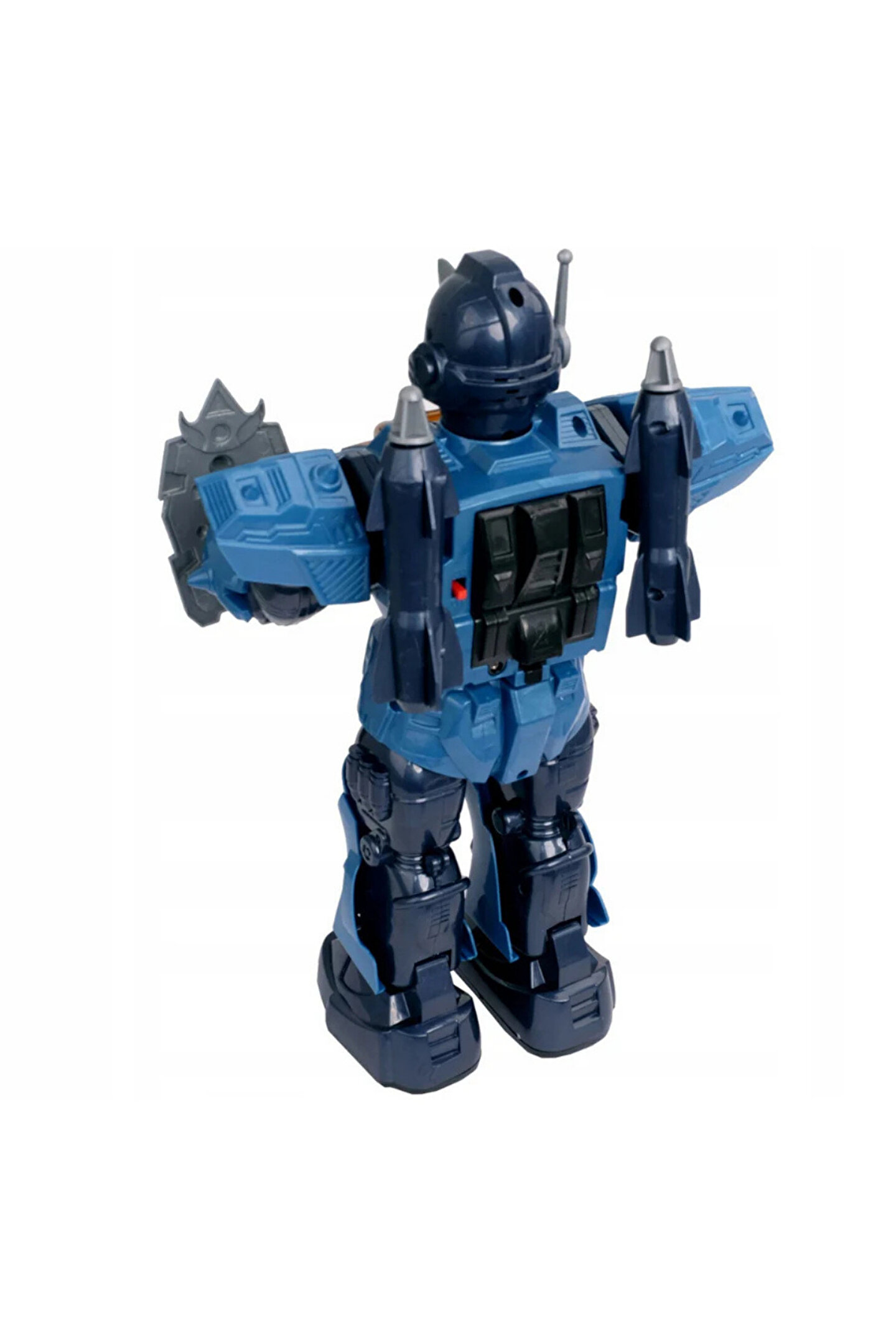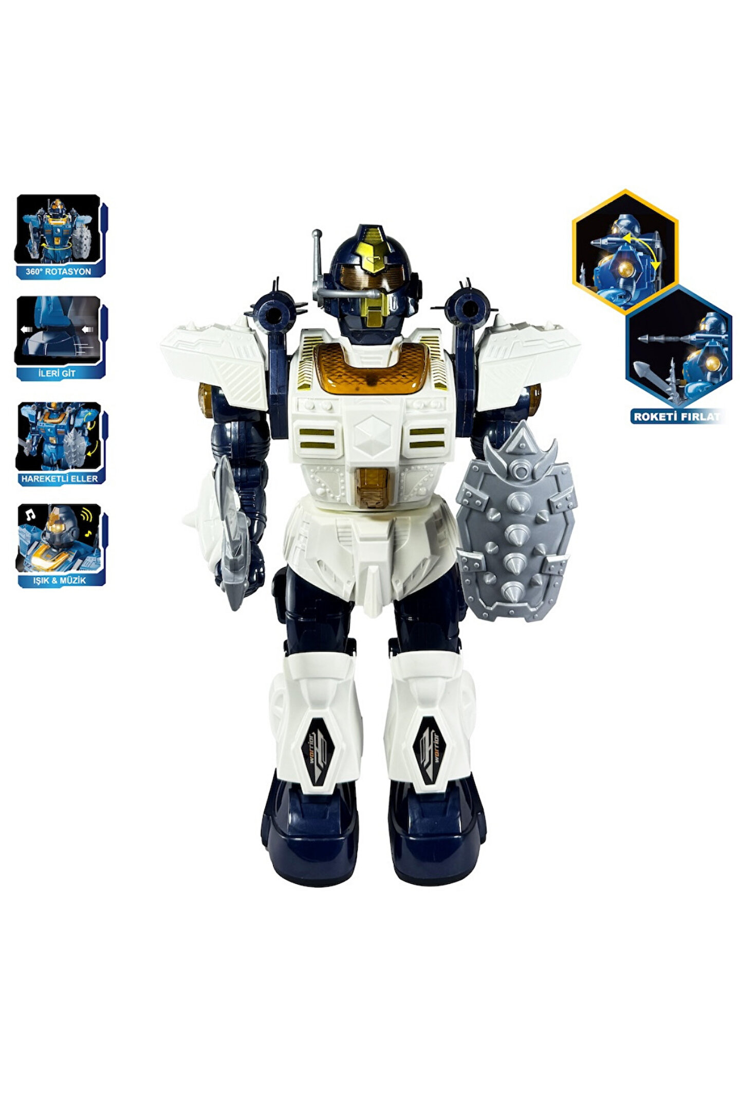 - 3 yaş ve üzeri çocuklar için ideal bir oyuncak seçeneği sunar, onların eğlenceli vakit geçirmelerini sağlar.; - Işıklı ve müzikli özellikleriyle dikkat çeken bu robot, çocukların görsel ve işitsel duyularını geliştirir.; - Roket atan fonksiyonu sayesinde çocuklar, aksiyon dolu oyunlar oynayarak hayal güçlerini kullanırlar.; - Kılıç ve kalkan gibi aksesuarlarla donatılmış olan savaşçı robot, çocukların rol yapma oyunlarına yeni bir boyut katar.; - 360° dönebilme özelliği ile çocukların motor becerilerini ve koordinasyon yeteneklerini destekler.; - Pilli çalışması sayesinde kolayca kullanılabilir ve çocukların enerji dolu oyunlarına eşlik eder.;