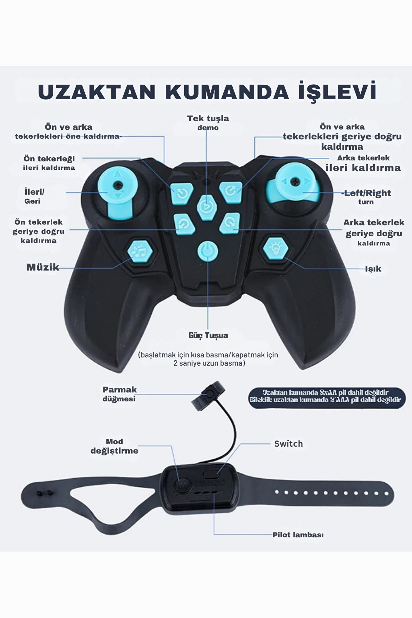 - Şarj edilebilir batarya ile uzun süreli oyun keyfi sunar.; - 3 yaş ve üzeri çocuklar için ideal bir oyuncak seçeneği olup, onların motor becerilerini geliştirmelerine yardımcı olur.; - Çılgın akrobat hareketleriyle çocukların eğlenceli vakit geçirmesini sağlar.; - Kolay kullanım için bilekten kontrol edilebilen uzaktan kumanda özelliği ile çocukların oyun deneyimini artırır.; - Piller kutu içeriğinde yer aldığı için ekstra pil ihtiyacını ortadan kaldırır ve hemen oyun keyfine başlamayı mümkün kılar.; - CN menşeili olup, Çin ana karasında üretilmiştir.;