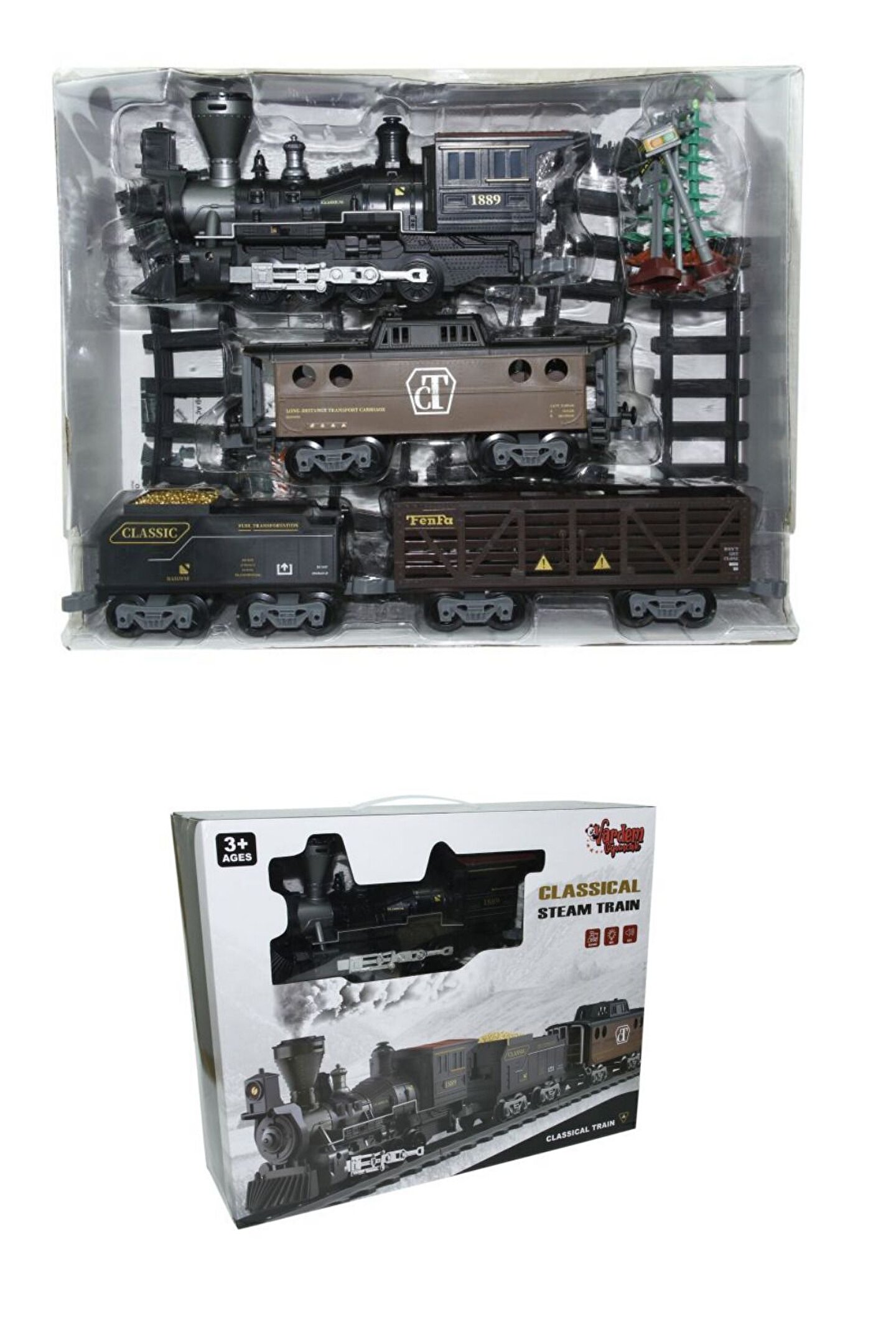 Bir oyuncak klasiği buharlı tren yeniden sizlerle! ; ; Rayları kurun, vagonları birbirine bağlayın, lokomotifin üzerindeki alana suyu doldurun ve buhar dolu bir yolculuğa başlayın! ; ; Üstelik trenin ses ve ışık efektleri sayesinde tren macerasını ikiye katlayın. Rayların üzerinde giden bu ışıklı tren tüm ailenin ilgisini çekecek! ; ; Çocukların; el-göz koordinasyonlarını, ince motor becerilerini, görsel algılarını, arkadaşlarıyla oyunlar oynayarak sosyalleşmelerini, odaklanma, yaratıcılık ve hayal güçlerinin gelişmesine yardımcı olan bir oyuncak tren setidir. ; ; Kutu İçerisinde; 1 adet lokomotif, 1 adet yolcu vagonu, 1 adet kömür vagonu, 1 adet hayvan taşıma vagonu, 1 adet su pipeti, 4 adet düz ray ve 6 adet kavisli ray yer almaktadır. ; ; 4 x 1,5V AA Pil ile çalışmaktadır. Piller kutuya dahil değildir. ; ; Ray uzunluğu: 135 cm. ; ; Kutu Ölçüsü; 42 x 13 x 33 cm. ; ;
