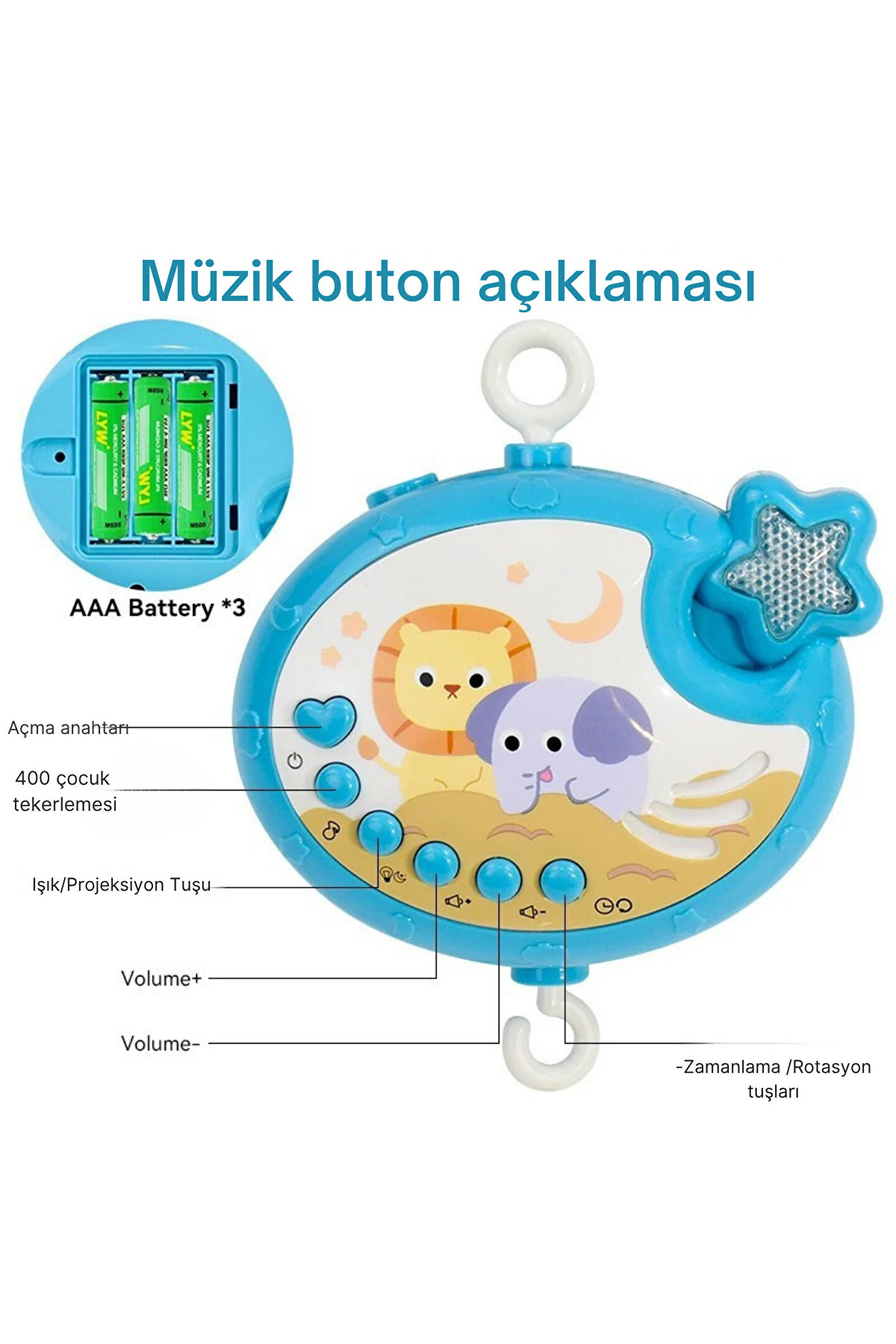 - Bebeğinizin uyku saatlerini daha keyifli hale getirmek için tasarlanmış, müzikli ve ışıklı projeksiyonlu bebek yatıştırıcı dönence.; - Kolay kullanım sunan kumanda özelliği ile bebeğinizin dikkatini çekecek şekilde ayarlanabilir ses seviyesi ve renk seçenekleri.; - 0 ila 1 yaş arası bebekler için idealdir; miniklerin gelişimine katkıda bulunan eğitici ve eğlenceli bir deneyim sağlar.; - Güvenilir ithalatçısı Vardem tarafından üretilmiş olup, kalite standartlarına uygun olarak tasarlanmıştır.; - Canlı mavi rengiyle hem şık görünüm sunar hem de bebeğinizin odasına neşe katar.; - Piller kutuya dahil değildir ancak kolayca temin edilebilen pillerle çalışır; böylece ekstra malzeme ihtiyacını ortadan kaldırır.