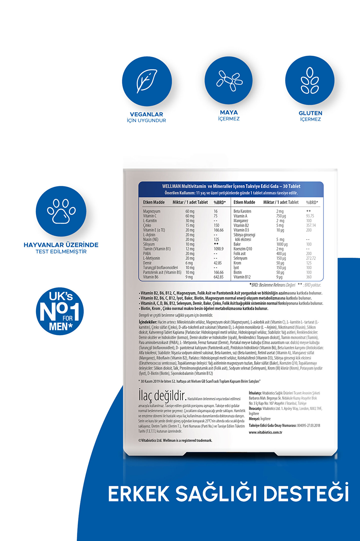 Wellman Original Wellman® Original, önemli vitamin ve minerallerin temel kaynağını sağlarken ayrıca Sibirya Ginsengi, Koenzim Q-10 ve amino asitlerIçermektedir. Erkeklerde bütüncül sağlığın korunmasına destek olur. Wellman ® original, 29 farklı mikronutrient Içeren geniş kapsamlı bir formülasyona sahiptir. Wellman® original, 25 yıldır uluslararası olimpiyat kurulu, tıbbi komisyon üyesi olan önceki vitabiotics yönetim kurulu başkanı, profesör Arnold Beckett tarafından yürütülen bir uzman ekip tarafından geliştirilmiştir. Wellman®, yüzücü Mark Foster da dahil olmak üzere İngiltere’de birçok profesyonel sporcu tarafından antrenmanlardaKullanılmaktadır. Wellman® İngiltere’de erkeklerin en çok tercih ettiği erkeklere özel formüle edilmiş multivitamindir . Vitamin B2, B6, B12, C, Magnezyum, Folik asit ve Pantotenik asit yorgunluk ve bitkinliğin azalmasına katkıda bulunur. ; Vitamin B2, B6, B12, C, iyot, bakır, biotin, magnezyum normal enerji oluşum metabolizmasına katkıda bulunur.; Vitamin A, C, D, B6, B12, selenyum, demir, bakır, çinko, folik asit bağışıklık sisteminin normal fonksiyonuna katkıda bulunur. ; Biotin, krom, çinko normal makro besin öğeleri metabolizmasına katkıda bulunur. ; Wellteen Her Genç kadınlar için özel olarak hazırlanmış geniş kapsamlı vitamin, mineral ve botanik ekstraktları içermektedir. Co-Q10, Cranberry ve Üzüm Çekirdeği ekstresiilavesi ile içerdiği Demir kırmızı kan hücrelerinin ve hemoglobinin normal oluşumuna katkıda bulunur. ; Biotin, Selenyum ve Çinko normal saç, deri ve tırnakların korunmasına katkıda bulunur. ; Vitamin B6,B12, C ve Pantotenik Asit yorgunluk ve bitkinliğin azalmasına katkıda bulunur. ; Vitamin B6 ve C normal enerji oluşum mekanizmasına katkıda bulunur. ; Wellman Original için Önerilen Kullanım 11 yaş üzeri yetişkinlerde günde 1 tablet alınması tavsiye edilir. ; Vejetaryenler için uygundur ; Gluten içermez ; Koruyucu içermez ; Tuz veya maya içermez ; Wellman® original hayvanlarda test edilmemiştir ; Wellteen Her için Önerilen Kullanım 13-19 yaş arasındaki genç kadınların günde 1 tablet alması tavsiye edilir. ; Vejetaryenler için uygundur ; Gluten içermez ; Koruyucu içermez ; Maya içermez ; Wellteen® Her hayvanlarda test edilmemiştir ;