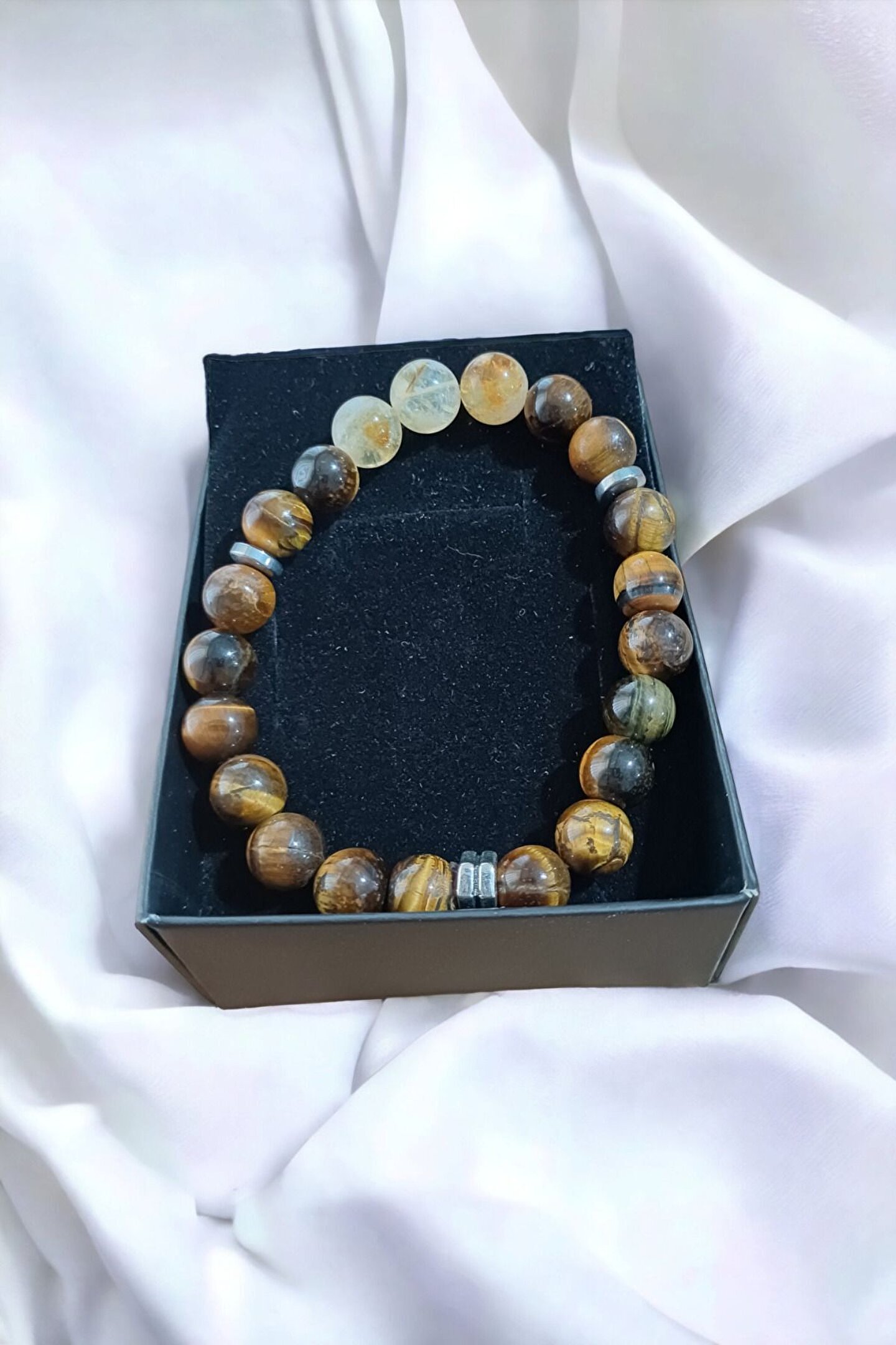 Doğal taş kullanımı ile öne çıkan bu bileklik, gençlerin enerjisini yansıtan stil sahibi tasarımıyla dikkat çeker.; Kaplan gözü ve sitrin taşının benzersiz kombinasyonu, bileğe şık ve modern bir görünüm kazandırır.; Taşların doğal yapısı, her biri eşsiz olan parçaların elde edilmesi nedeniyle her bilekliğe farklı bir karakter kazandırır.; Gençlerin tarzını tamamlayan bu bileklik, günlük kullanımda rahatlıkla tercih edilebilir ve her türlü kıyafetle uyum sağlar.;