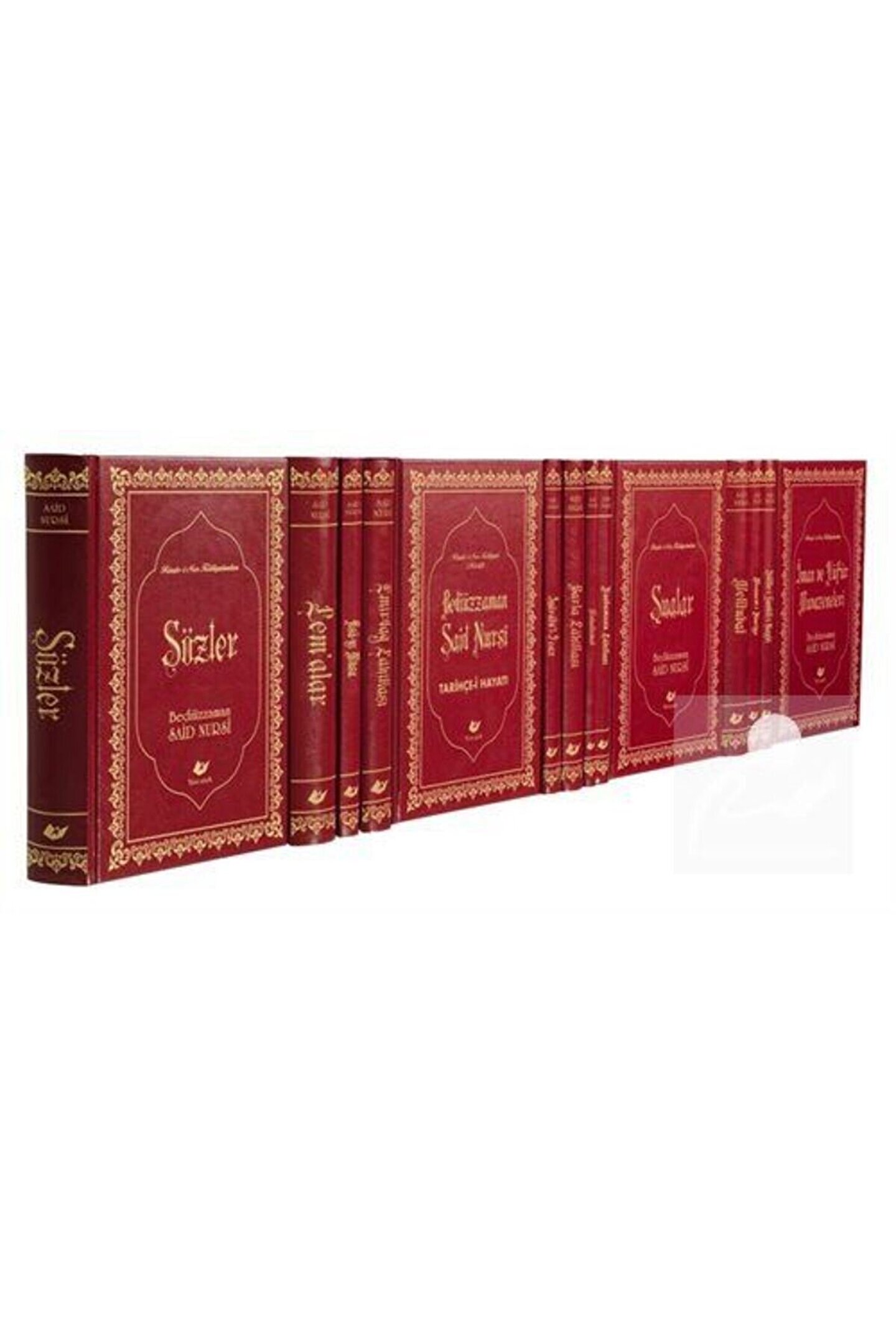 Risale-i Nur Külliyatı (Yeni Tanzim, Büyük Boy, 14 Cilt) (Kod 8775) Bediüzzaman Said Nursi / Yeni Asya Neşriyat Basım Yılı: 2020; Baskı: 1; Sayfa Sayısı: 5420; Kağıt Türü: Şamuha Kağıt; Ebat: 17 x 24; Dil: Türkçe; Cilt Durumu: Plastik; ISBN: 9789755258775; Yazar: Bediüzzaman Said Nursi; Çağımız hususiyetlerini tahlil ve manevî hastalıklarını teşhis eden Bediüzzaman "Zaman imân kurtarmak zamanıdır formülü çerçevesinde kaleme aldığı Risale-i Nurla bu zamanın manevî ihtiyaçlarına tatminkâr cevaplar veren iman hazinesini ortaya koymuştur.; Bu eserlerde her insanın zihnini meşgul eden ve modern çağ insanlarının da bigâne kalamayacağı Ben kimim? Nereden geldim? Nereye gidiyorum? Bu dünyadaki vazifem nedir? suallerine doyurucu izahlar getirilmekte; başta Allaha iman olmak üzere bütün iman esasları izah ve ispat edilmekte; bu konularda fen ve felsefe adına ortaya konulan şüphe ve sualler ikna edici bir üslûpla cevaplandırılmakta; ilimle dinin uzlaşmazlığı yolundaki iddialar püskürtülerek ilme din namına sahip çıkılmakta; İslâmı dejenere etmek maksadıyla girişilen tahrifatçı tahrip teşebbüsleri boşa çıkarılmakta; maddeci anlayışa bina edilen medeniyetin insanlığı sürüklediği manevi buhranlar Kurânın tevhid ve haşir gibi geniş hakikatlerine dair aklı doyuran ruhu okşayan kalbi tatmin eden tatlı izahlarla tedavi edilmekte; ruhun ve kalbin vazifesizliğinden doğan sıkıntıların sürüklediği sefahet ve başıboşluk hali Kurân mesajıyla izale edilmektedir.; Modern çağ insanının aradığı Kurân yorumunu en mükemmel şekliyle Risale-i Nurda bulmak mümkündür.; Risale-i Nur Kurânın bu asra bakan mesajını anlayıp yorumlama hususunda "tecdit vazifesini ifa etmiş bir tefsirdir.; Modern çağ insanının aradığı Kurân yorumunu en mükemmel şekliyle anlatan Risale-i Nur Külliyatını yepyeni bir tanzime okurların hizmetine sunuyoruz.; Özellikler 1 - Yeni tanzim 2 - Lüks baskı 3 - Ivory kâğıt 4 - Büyük boy (17 x 24 cm) 5 - 14 kitap 6 - 5.420 sayfa 7 - Ayet-Hadis mealleri ve kaynakları geçtiği sayfanın altına konulmuştur.; 8 - Arapça ve Farsça metinlerin tercümeleri.; 9 - Fihrist