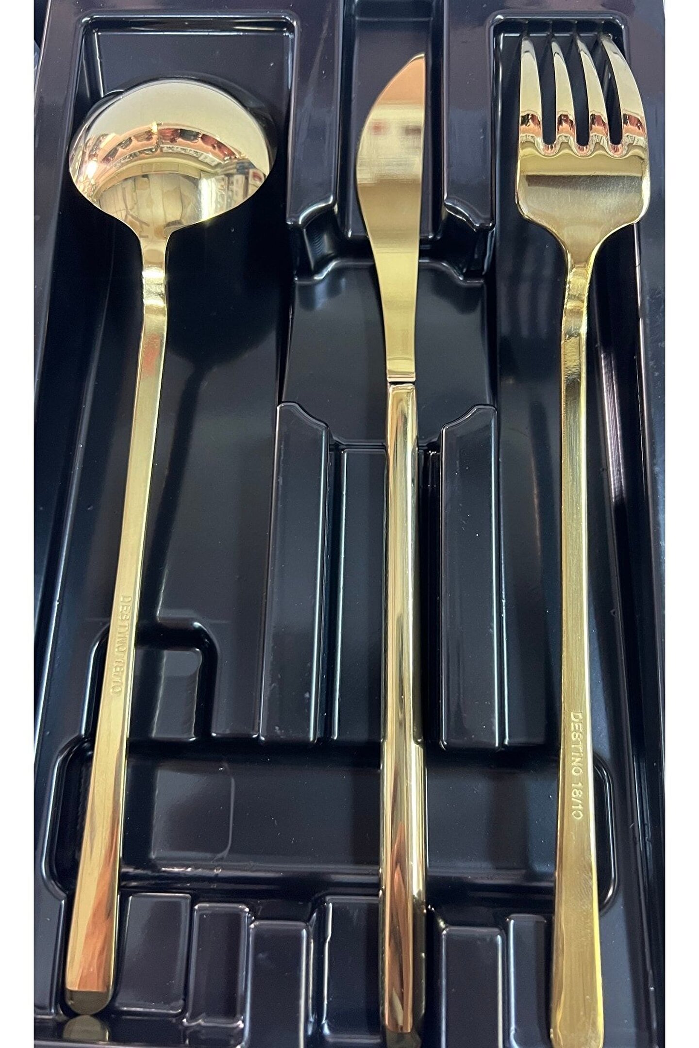 12 kişilik geniş kapasiteye sahip, her türlü sofranız için ideal bir çatal; bıçak; kaşık seti; Dayanıklı çelik materyali ile uzun ömürlü kullanım sunar ve şık görünümüyle göz alıcı bir sofra düzeni sağlar; Altın rengi detaylarıyla zarif bir dokunuş ekleyerek sofralarınıza lüks bir hava katar;