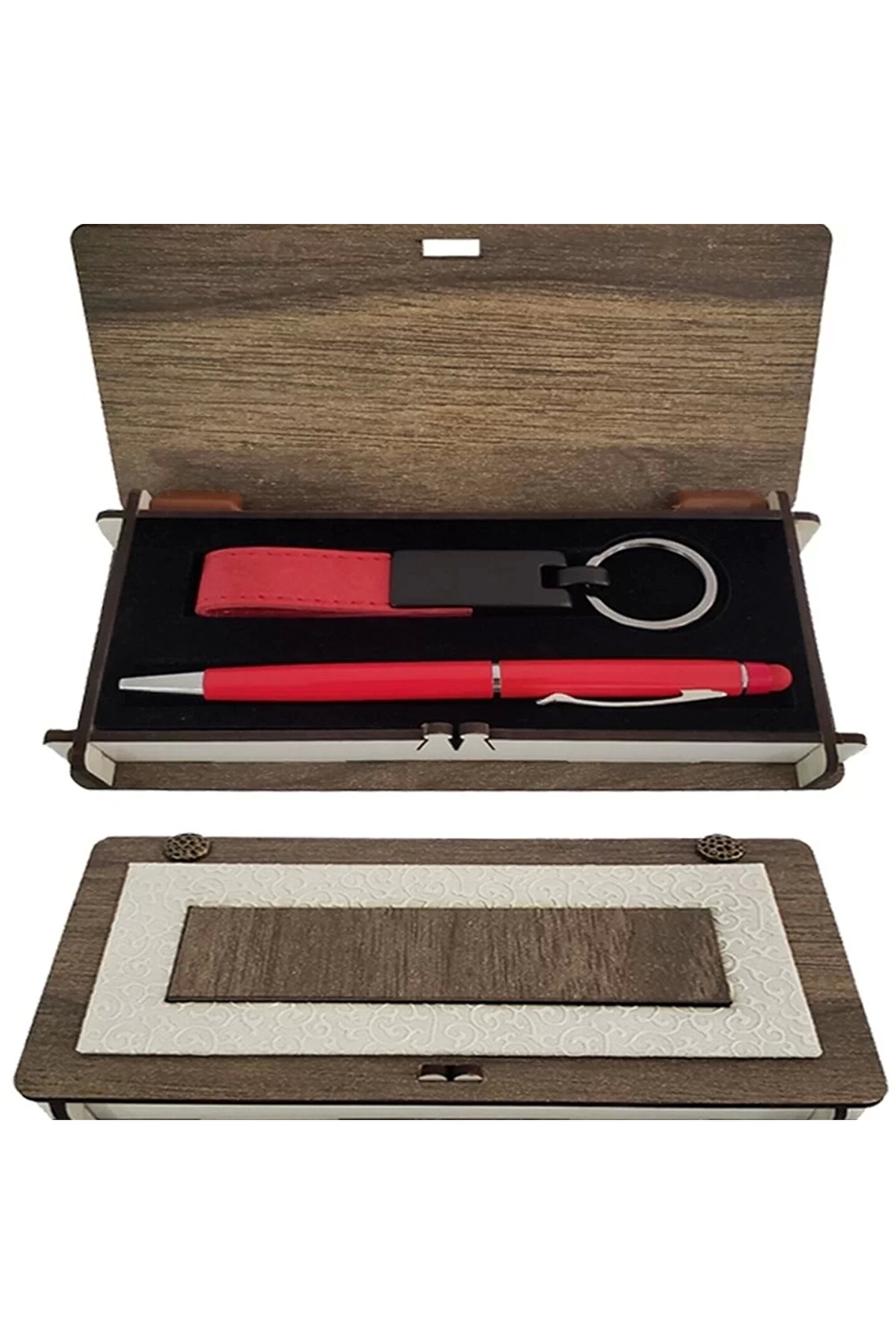 Ahşap Kutulu Kırmızı Anahtarlık Ve Kalem Set
