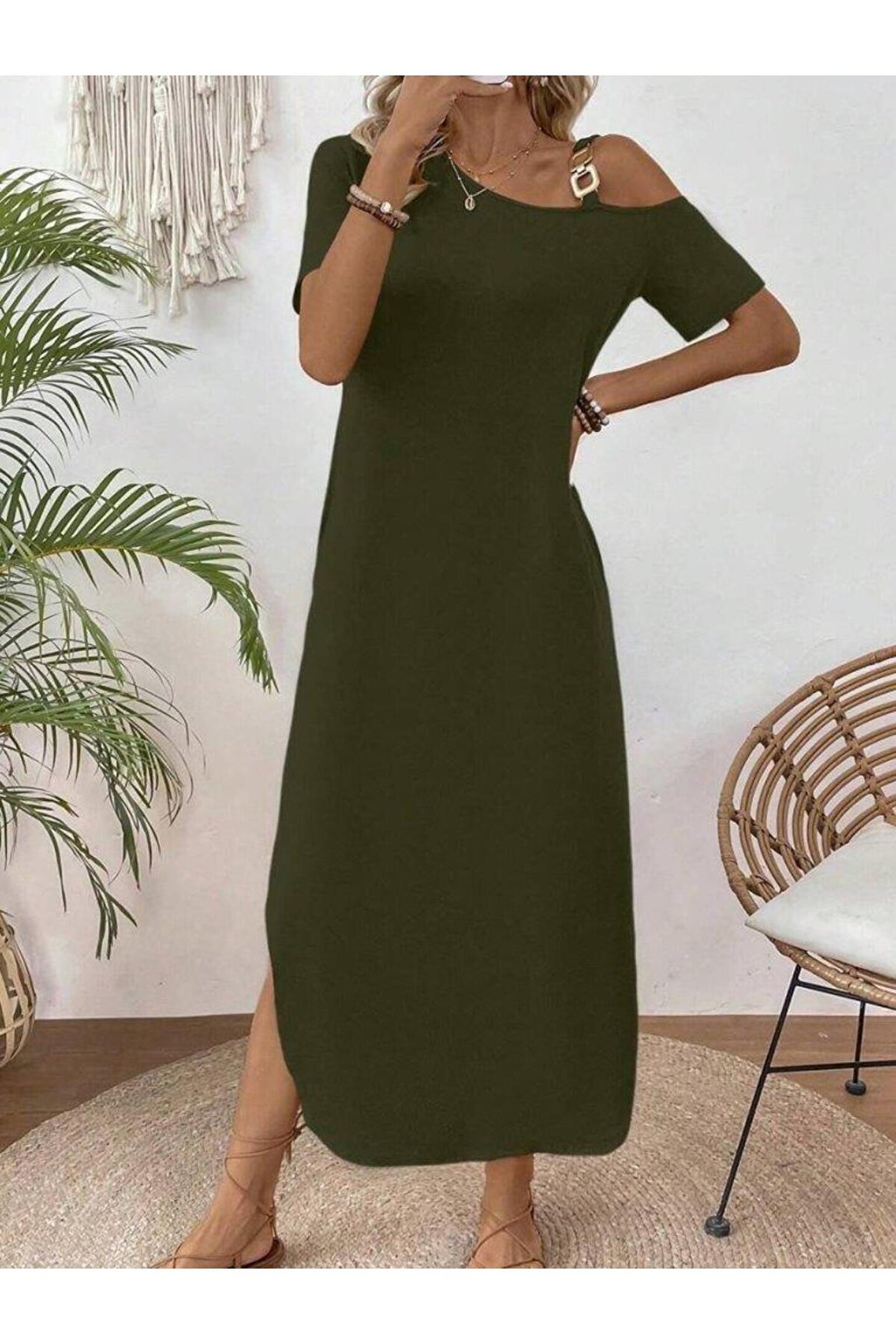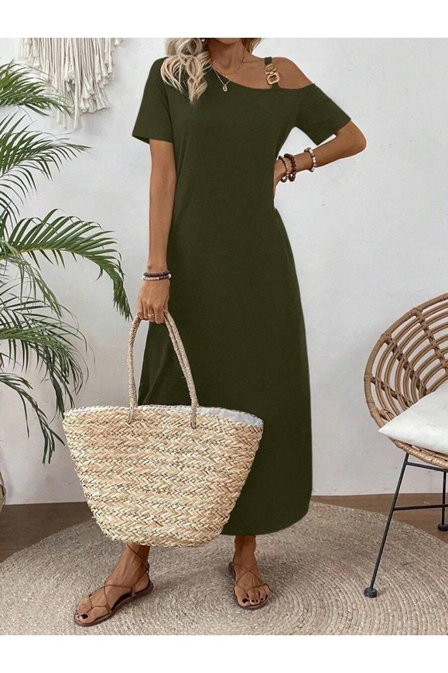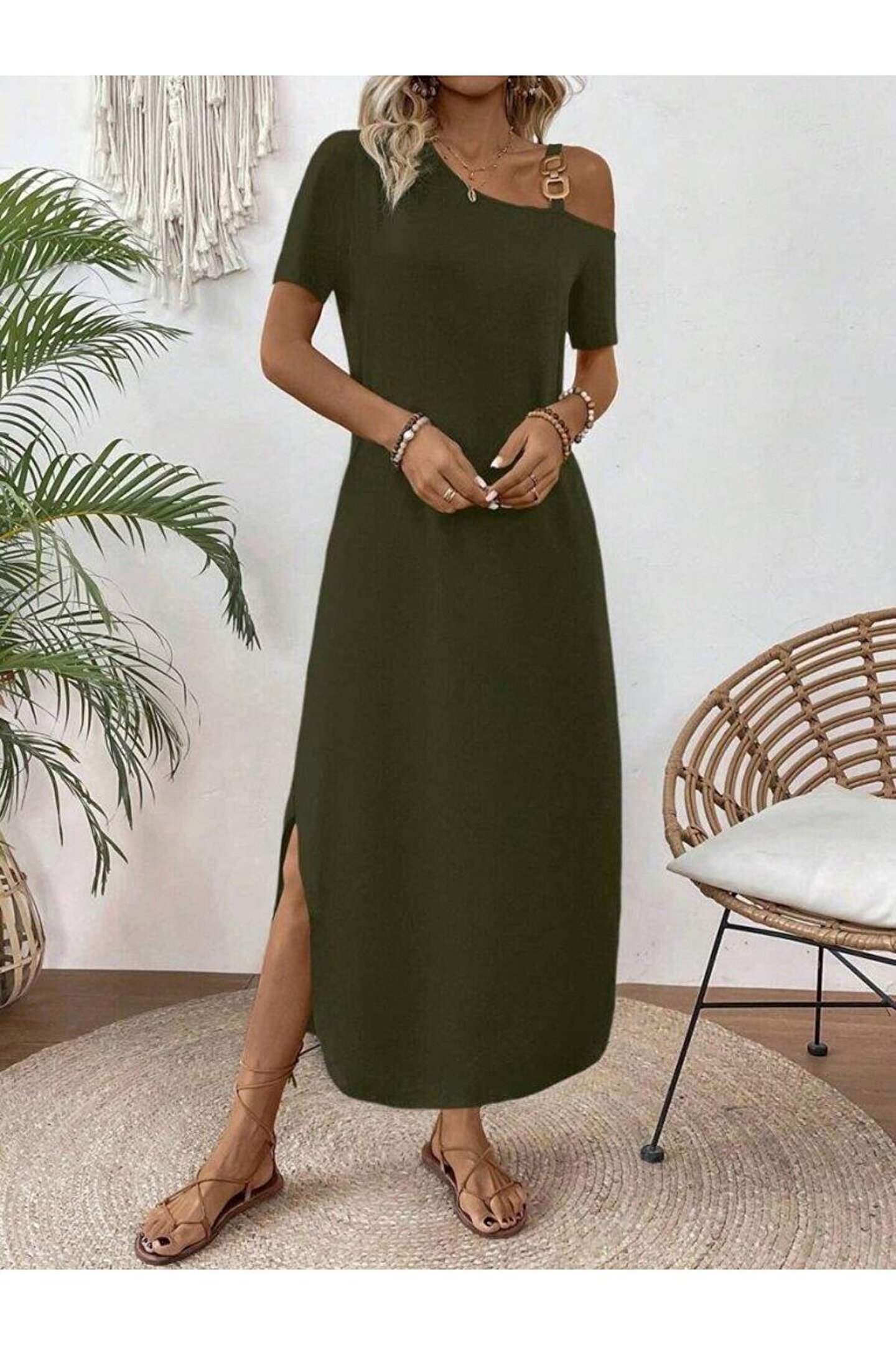 Kadın Tek Omuzdan Açık Toka Detaylı Yandan Yırtmaçlı Maksi Boy Viskon Elbise