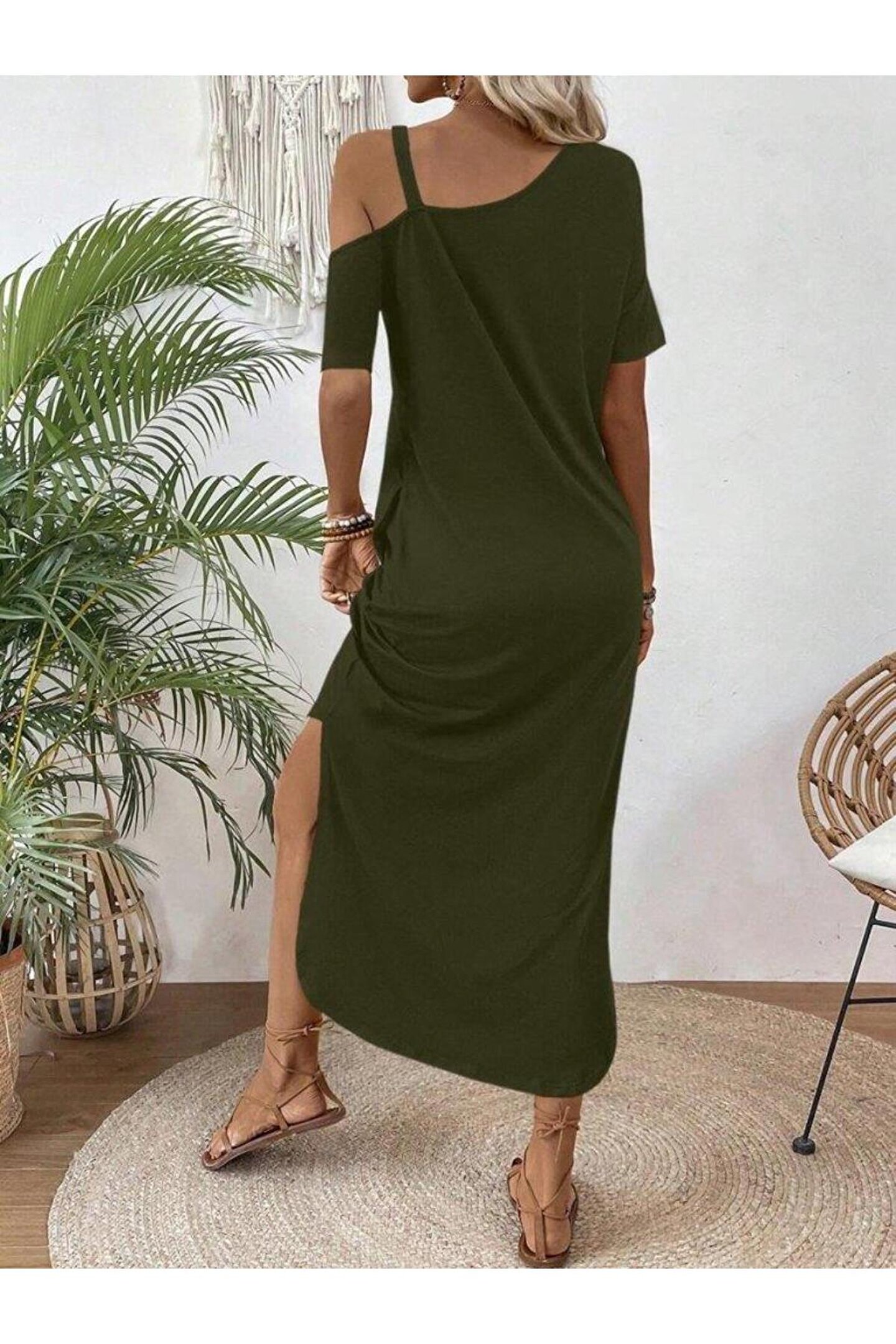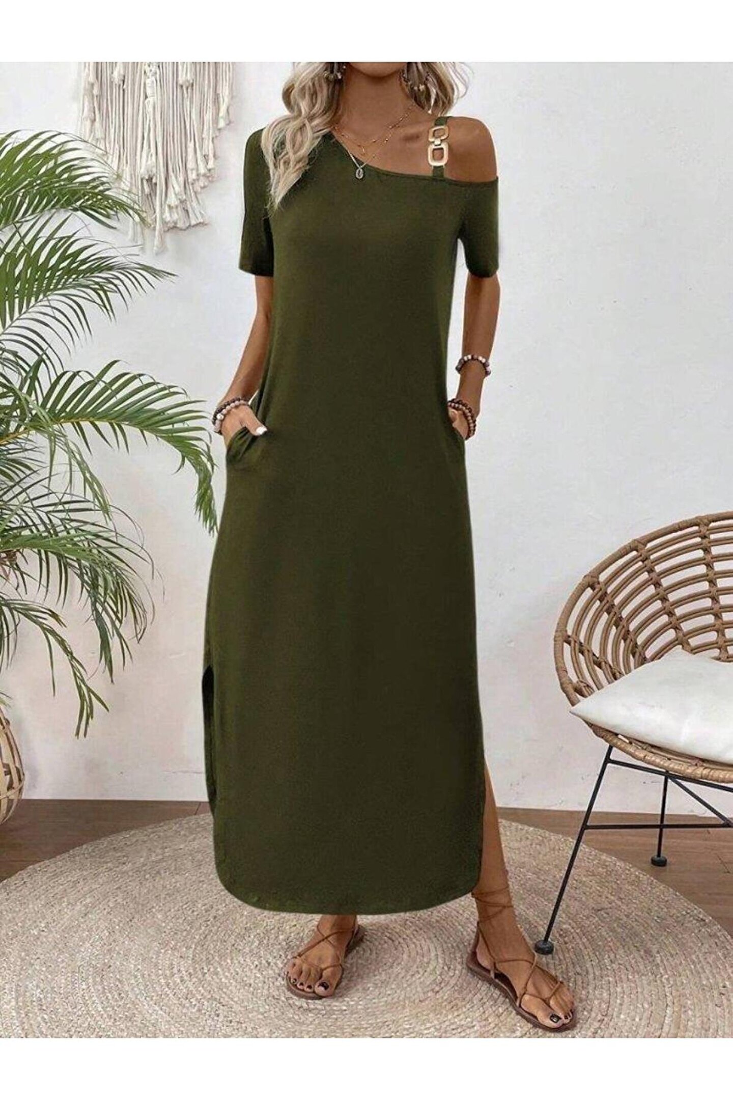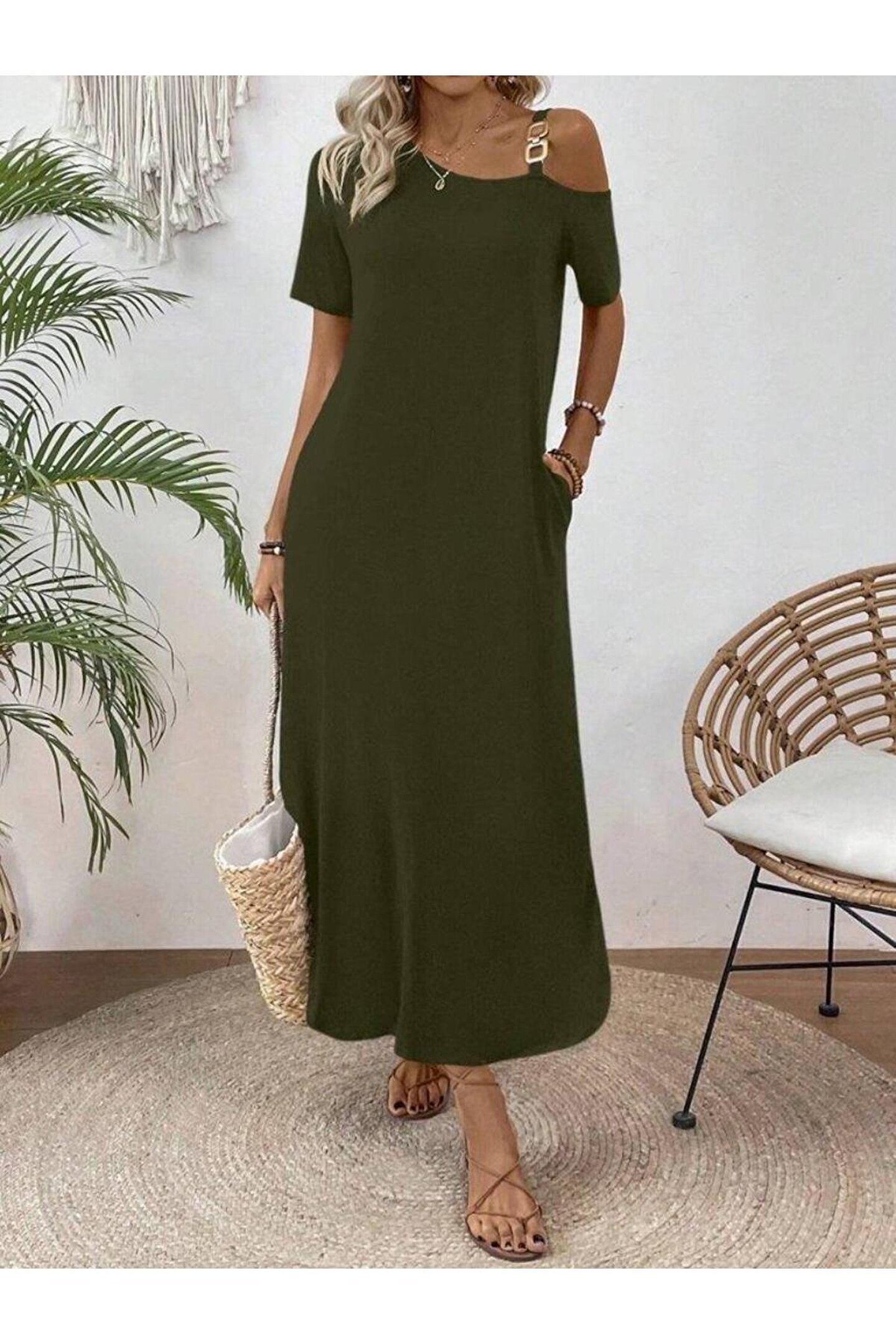 Kadın Tek Omuzdan Açık Toka Detaylı Yandan Yırtmaçlı Maksi Boy Viskon Elbise