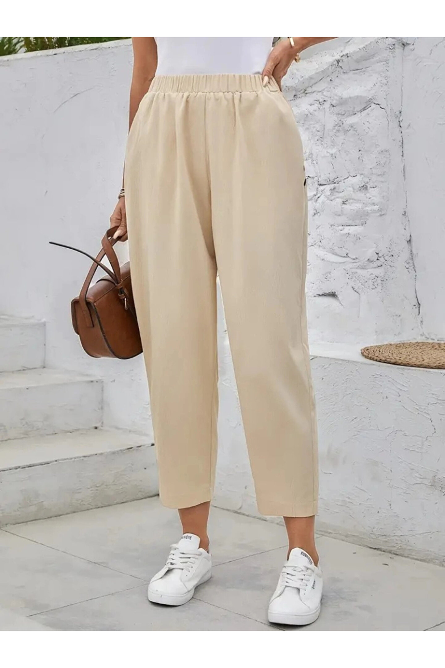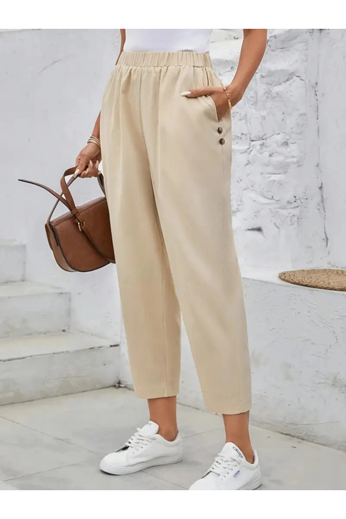 YOMNA MDB Kadın Yüksek Bel Yandan Cepli Düğme Detaylı Geniş Kesim Ithal Krep Pantolon