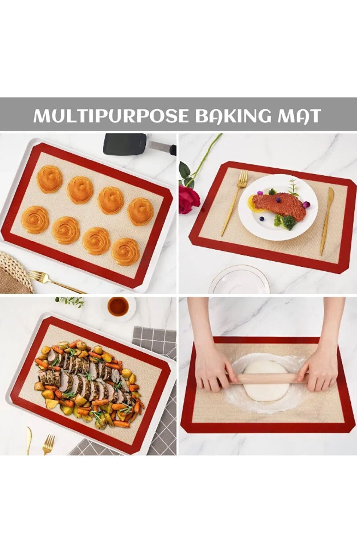 timbrado 30x40 Fırınlanabilir Yıkanabilir Kendinden Yağlı Silikon Pişirme Ve Hamur Açma Matı Silpatı KOLAY TEMİZLENEBİLİR 1; SINIF PİŞİRME MATI SİLİKON FIRIN SİLPATI; Yıkanabilir Kendinden Yağlı Silikon Yapısı ile Mutfaktaki İşinizi Çok Rahatlatacaktır; Fırında patates,tavuk,balık,kurabiye,kırmızı et vb gıdalarınızı yağ kullanmadan sağlıklı bir şekilde pişirme işlemini gerçekleştirebilirsiniz; Silikon fırınlanabilir pişirme matı yağlı zemine sahip olması sayesinde üzerinde kolayca yapışma yapmadan hamur açabilirsiniz; Silikon mat bulaşık makinesinde yıkanabilir özelliğe sahiptir; Yanmaz yapışmaz fırınlanabilir; (; 40 ° ile +250 °) arası sıcaklığa dayanıklıdır; Fırınlarınızda gönül rahatlığı ile kullanabilirsiniz; Gıda temasına uygun materyallerden üretilerek insan sağlığına asla zarar vermez; Kesinlikle zararlı madde içermemektedir; Yanmaz yapışmaz özel tasarımı sayesinde mutfaklarınız vazgeçilmezi olacaktır; Kendinden yağlı zemine sahip olup yağlamak gerektirmez; ***ÜRÜN ÖLÇÜSÜ 30CMx40CM ŞEKLİNDEDİR; *** ;;