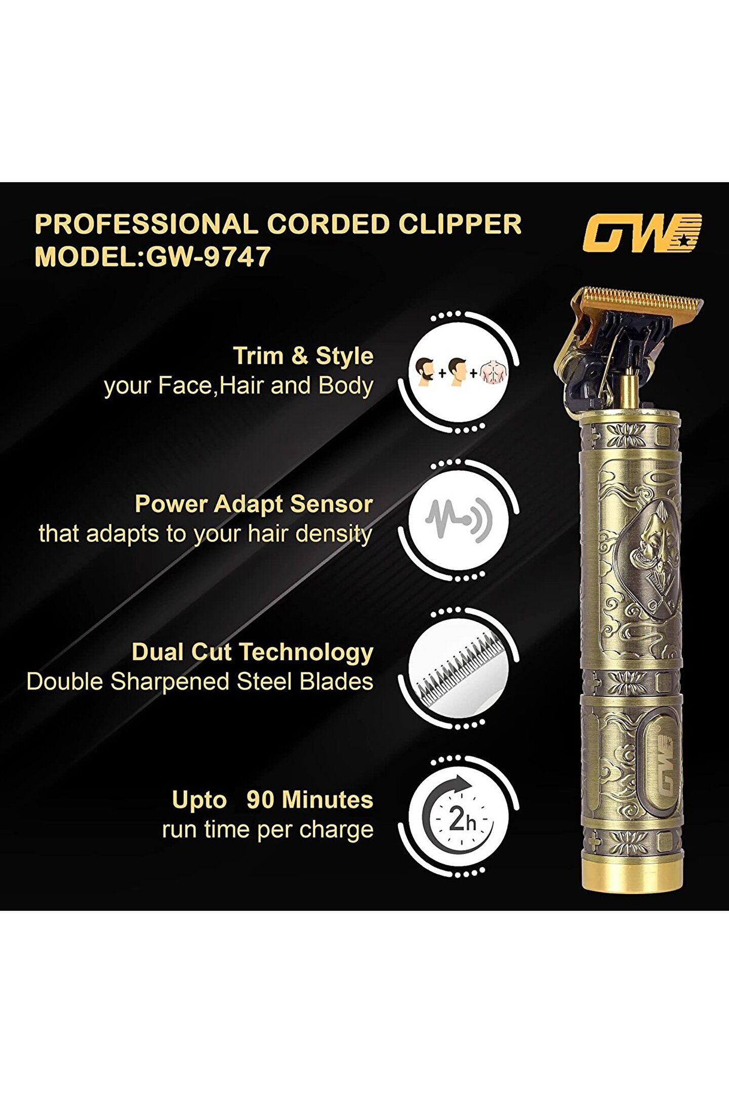 Mükemmel Traş Deneyimi GW-9747 Profesyonel Traş Makinesi, mükemmel traş deneyimi sunmak için tasarlanmış son teknoloji bir cihazdır. ; İster günlük tıraşınızı yapın, ister özel bir etkinlik için hazırlanın, bu traş makinesi size her zaman keskin ve rahat bir tıraş sunar. ; Ana Özellikler: Keskin ve Dayanıklı Bıçaklar: Paslanmaz çelikten üretilmiş keskin bıçaklar, her türlü saç tipi ve sakal türüne kolayca hükmeder. ; Uzun ömürlü ve keskinliği koruyan bıçaklar sayesinde her zaman mükemmel sonuçlar elde edersiniz. ; Hassas Tıraş Seçenekleri: GW-9747, 3 farklı tıraş moduyla gelir. ; Hassas, normal ve hızlı tıraş modları arasında seçim yapabilirsiniz, böylece tıraş ihtiyaçlarınıza göre kişiselleştirilmiş bir deneyim elde edersiniz. ; Şarj Edilebilir ve Uzun Pil Ömrü: Şarj edilebilir bataryası sayesinde her zaman kullanıma hazır olursunuz. ; Tek bir şarjla uzun süre kullanabilirsiniz ve pil ömrü göstergesi ile ne zaman şarj etmeniz gerektiğini takip edebilirsiniz. ; Kompakt ve Taşınabilir: Şık ve ergonomik tasarımı, traş makinesini kolayca taşımanıza ve seyahatlerde yanınıza almanıza olanak tanır. ; Kolay Temizlik: Makinenin bıçakları ve aksesuarları kolayca çıkarılabilir ve temizlenebilir, böylece hijyenik bir tıraş deneyimi yaşarsınız. ; GW-9747 Profesyonel Traş Makinesi ile her gün bakımlı ve şık görünümünüzü koruyun. ; Mükemmel tıraş sonuçları için güvenilir bir partnerdir ve her erkeğin bakım rutininde olması gereken bir aksesuardır. ; Şimdi GW-9747 ile traş deneyiminizi yükseltin!;